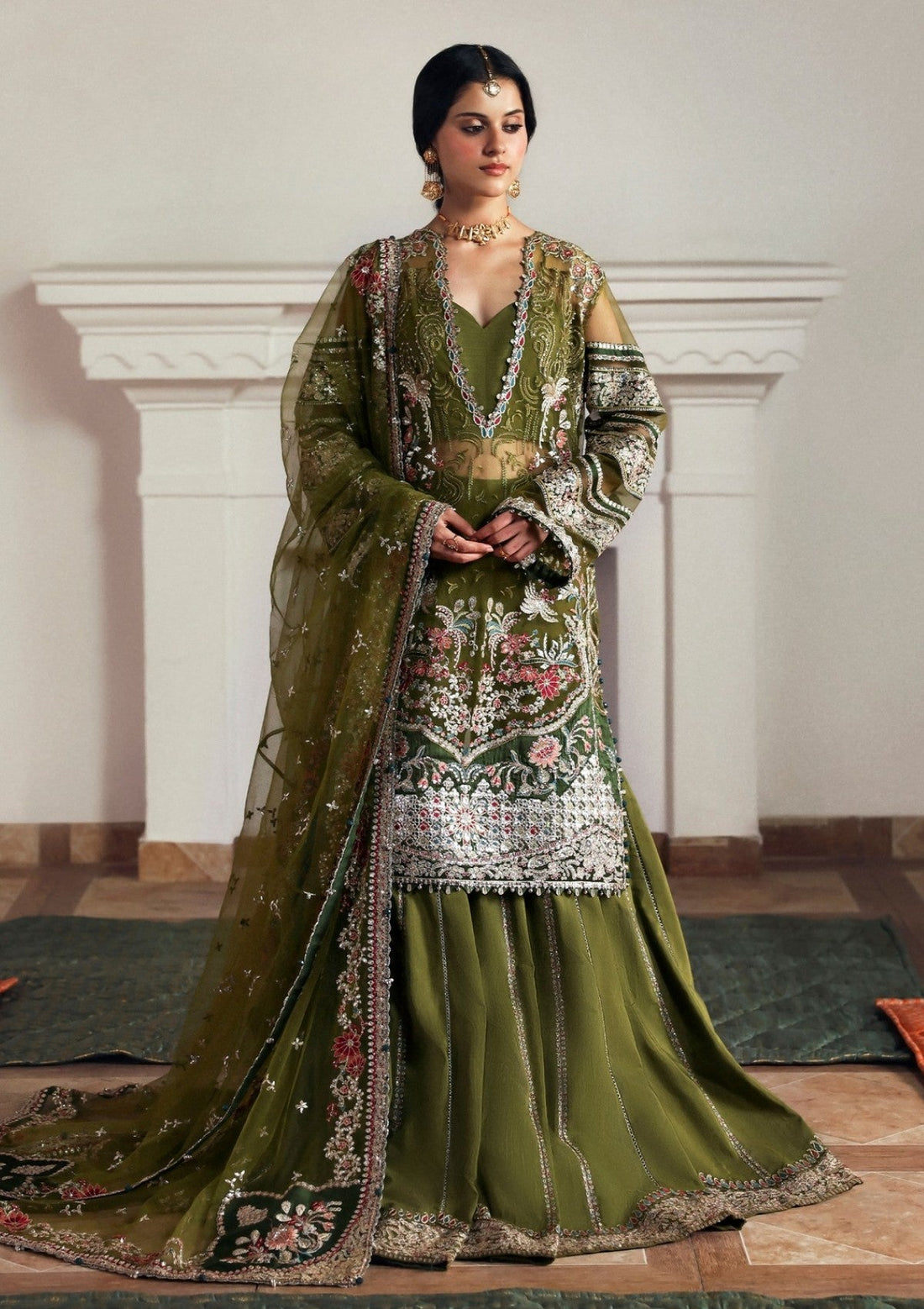 Outfit Type: Eastern Style: Gharara Color Type: Olive Green Package Includes: 3 Piece Top ,...