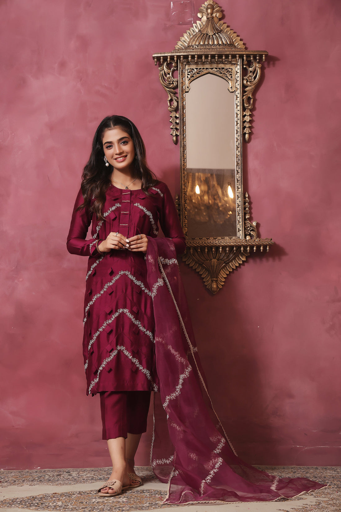 This milange outfit is made on pure organza shirt & dupatta with intricate crotia laces...