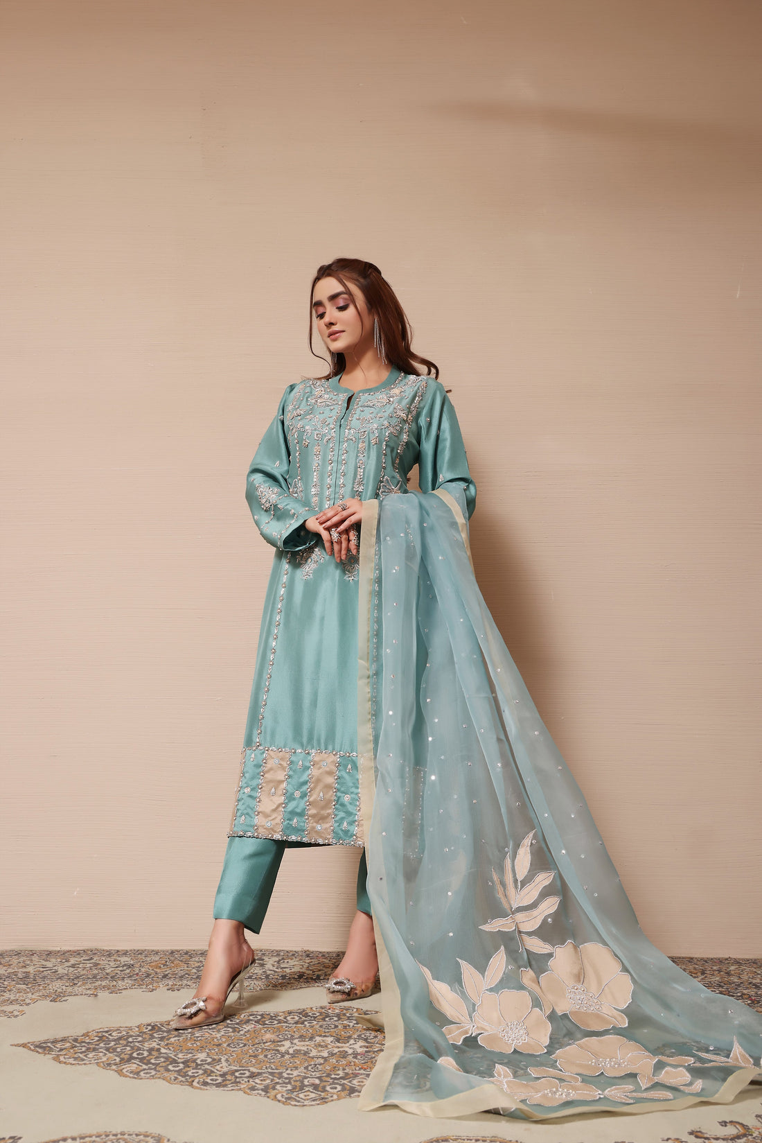 This Teal outfit comprises of delicately curated on sheesha silk & organza dupptta with fine...