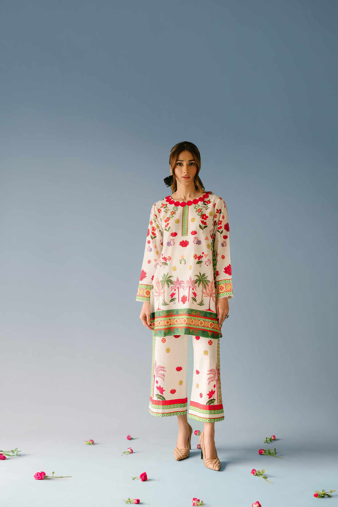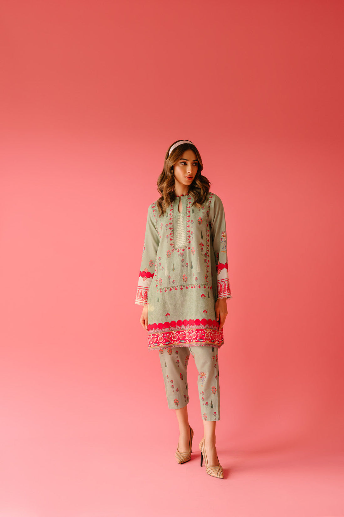 Pure khaddar digital print shirt with embroidered scallops on daaman and sleeves. Paired with matching...