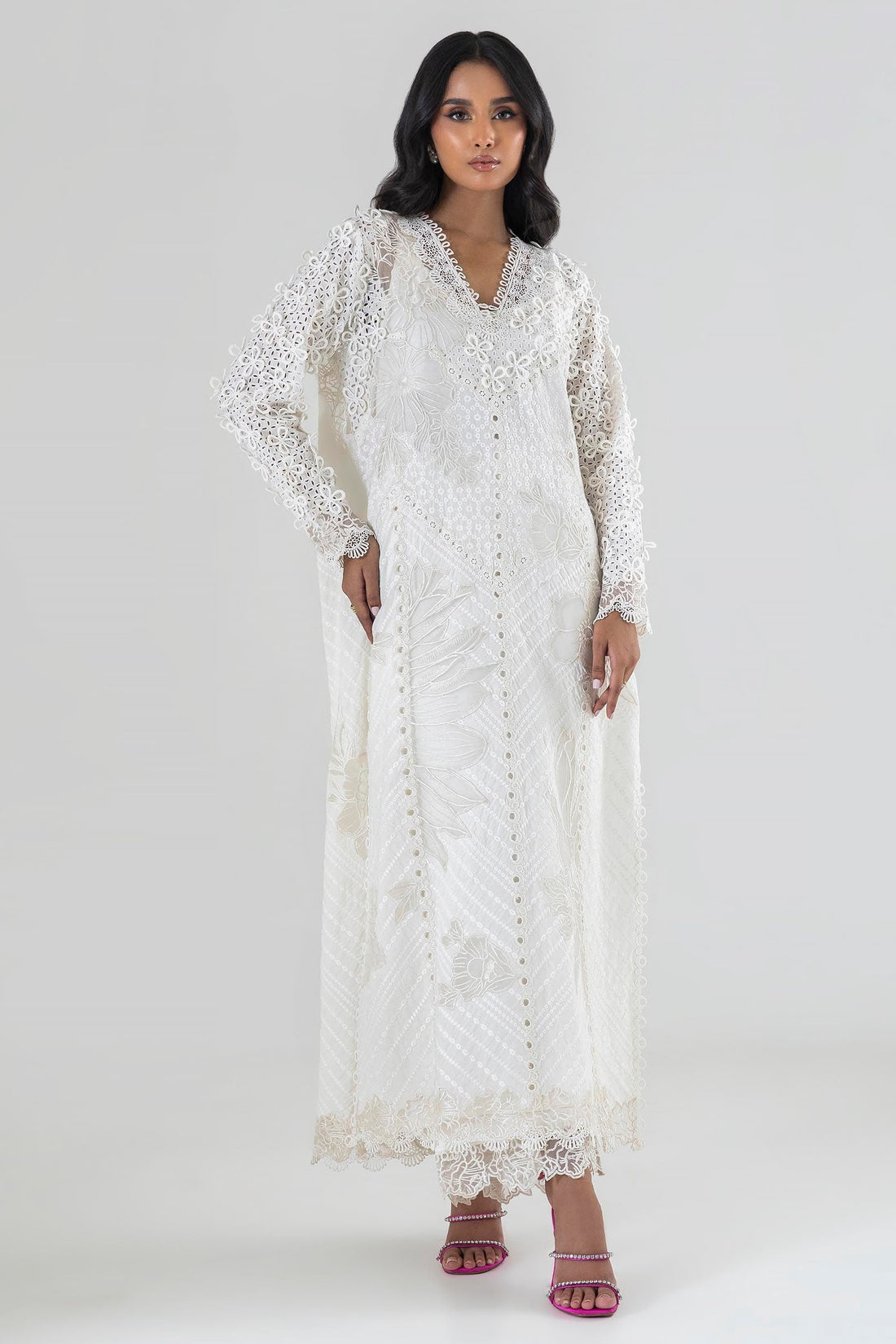 Description: Grace and detail: An intricately designed silhouette that mesmerizes. Color: Off White Fabric: Embroidered...