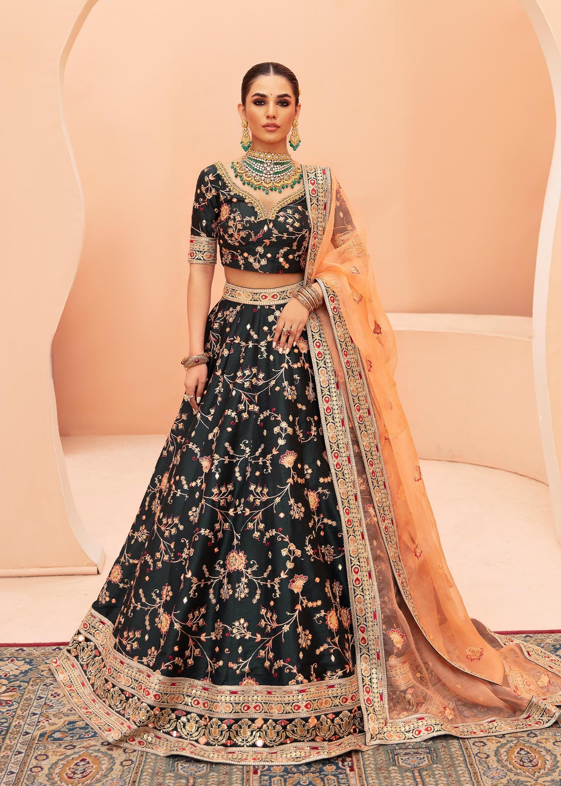 An ensemble for bridal wear or formal wear, a majestic lehenga set in rich hue...
