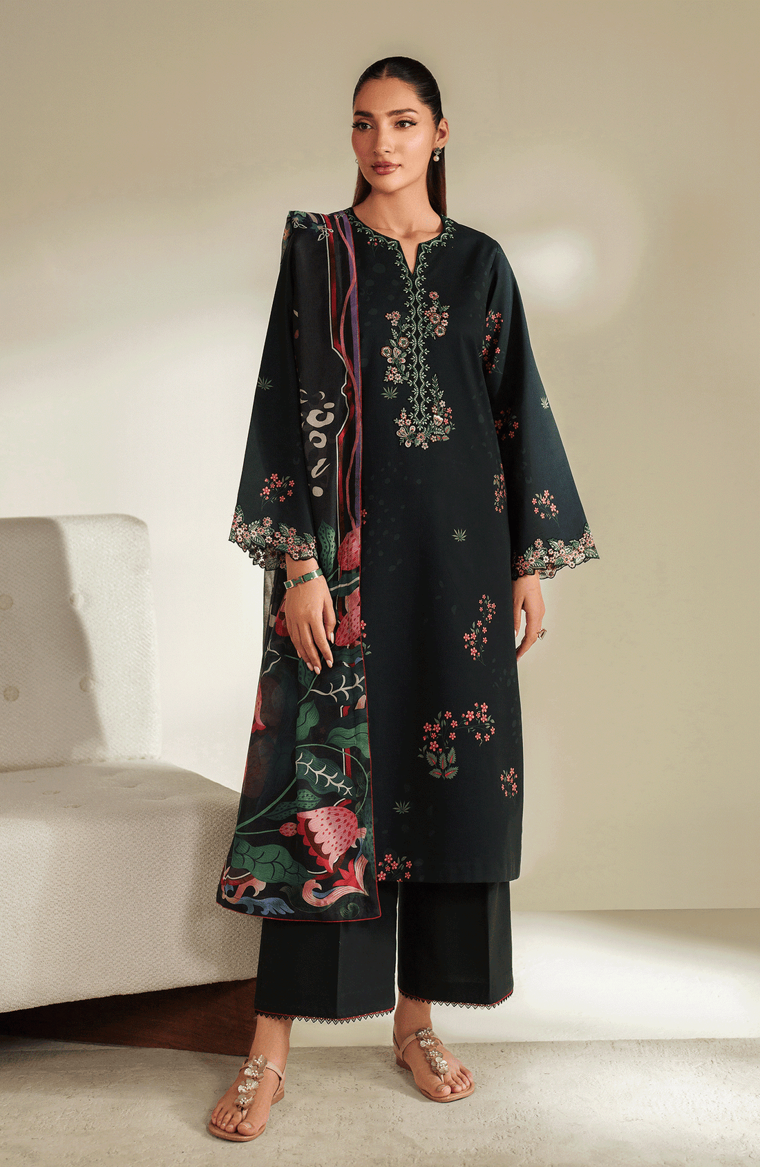 A midnight black three-piece ensemble that blends modern digital print with traditional craftsmanship. The cambric...
