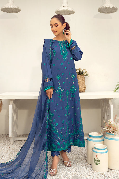 Description: Experience the epitome of sophistication with this luxurious three-piece embroidered cotton net suit, featuring...