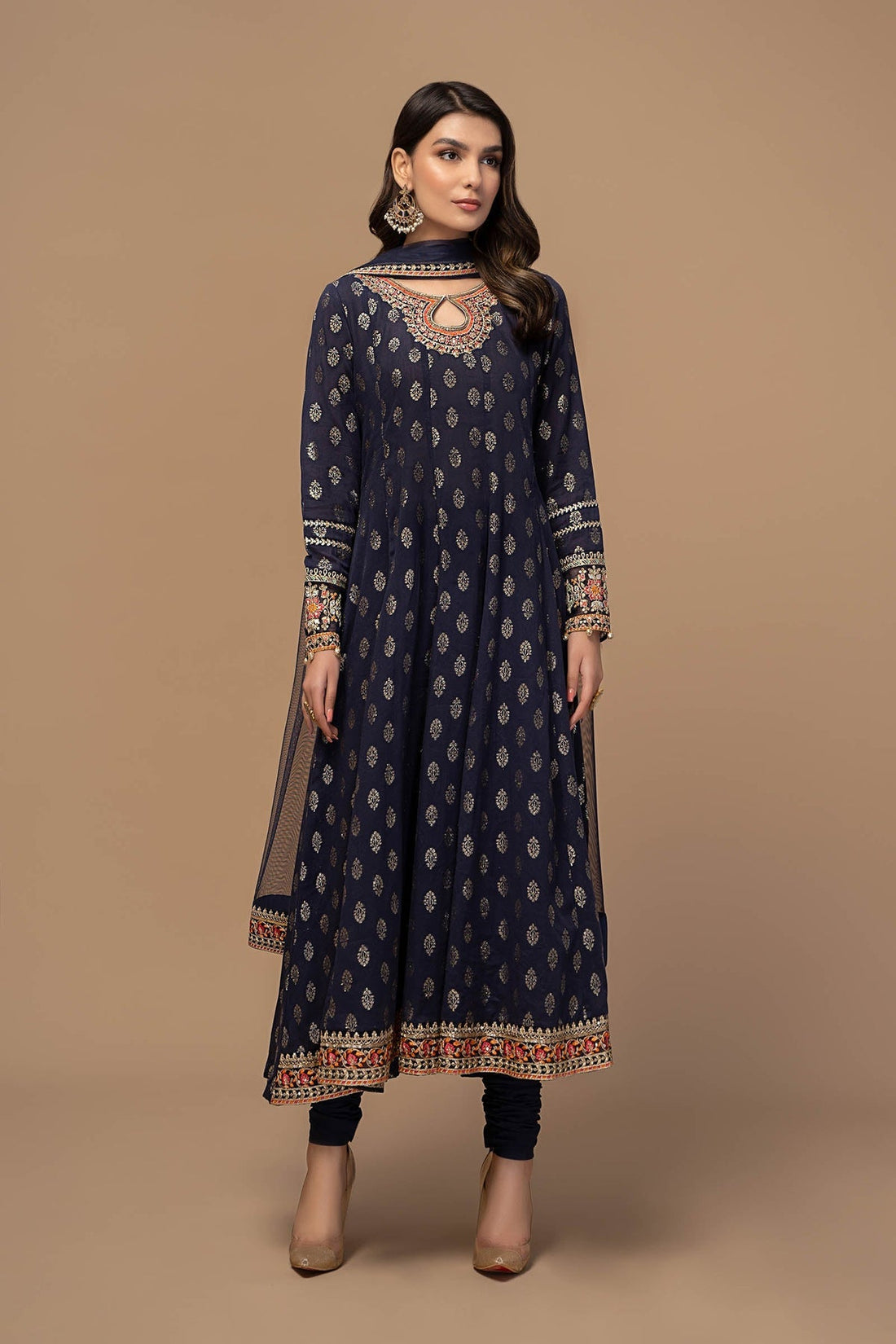 Shirt fabric: jacquardTrouser fabric: LawnDupatta fabric: NetLong frock with panels embroidered neckline embroidered sleeves and...