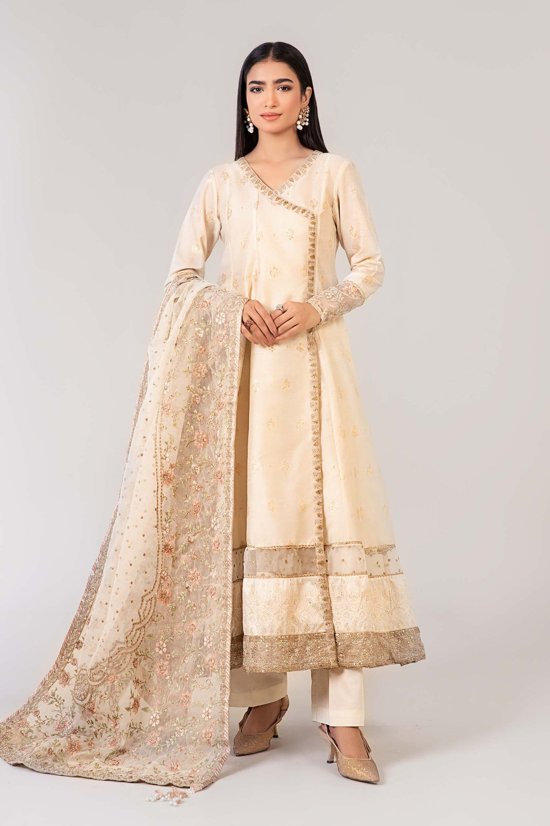 Frock fabric: Rawsilk lurexTrouser fabric: Cotton satinDupatta fabric: OrganzaLong panelled angrakha frock with embroidered neckline...