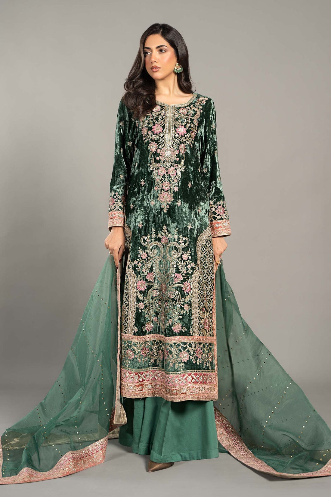 Shirt A-Line ShirtEmbroidered Round NecklineDyed Front With EmbroideryDyed BackFit: RegularColor: GreenFabric: VelvetTrousers Dyed Dhaka TrousersElasticated...