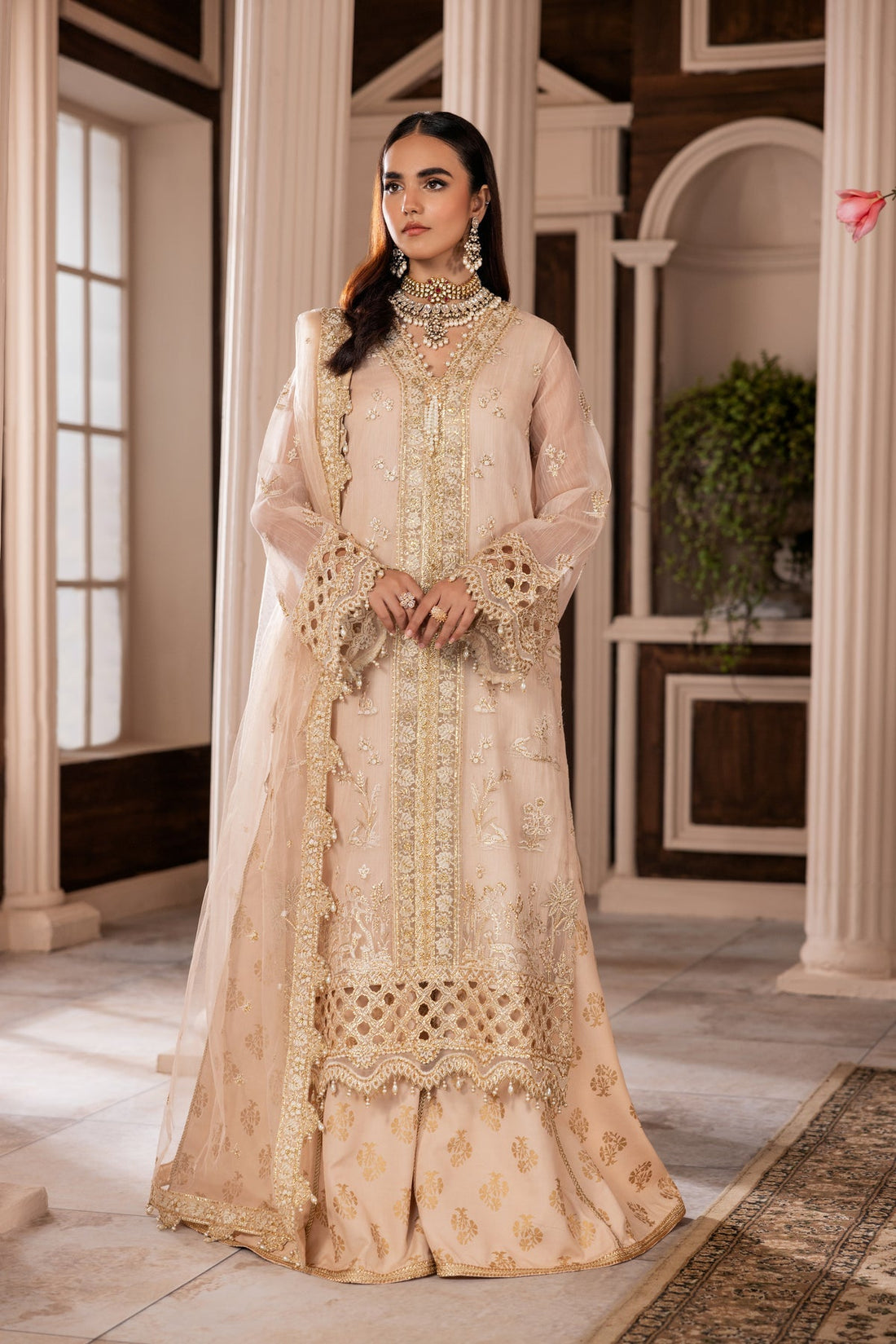A coral-peach organza hand-embellished shirt paired with a golden tissue gharara and a net screen-printed...