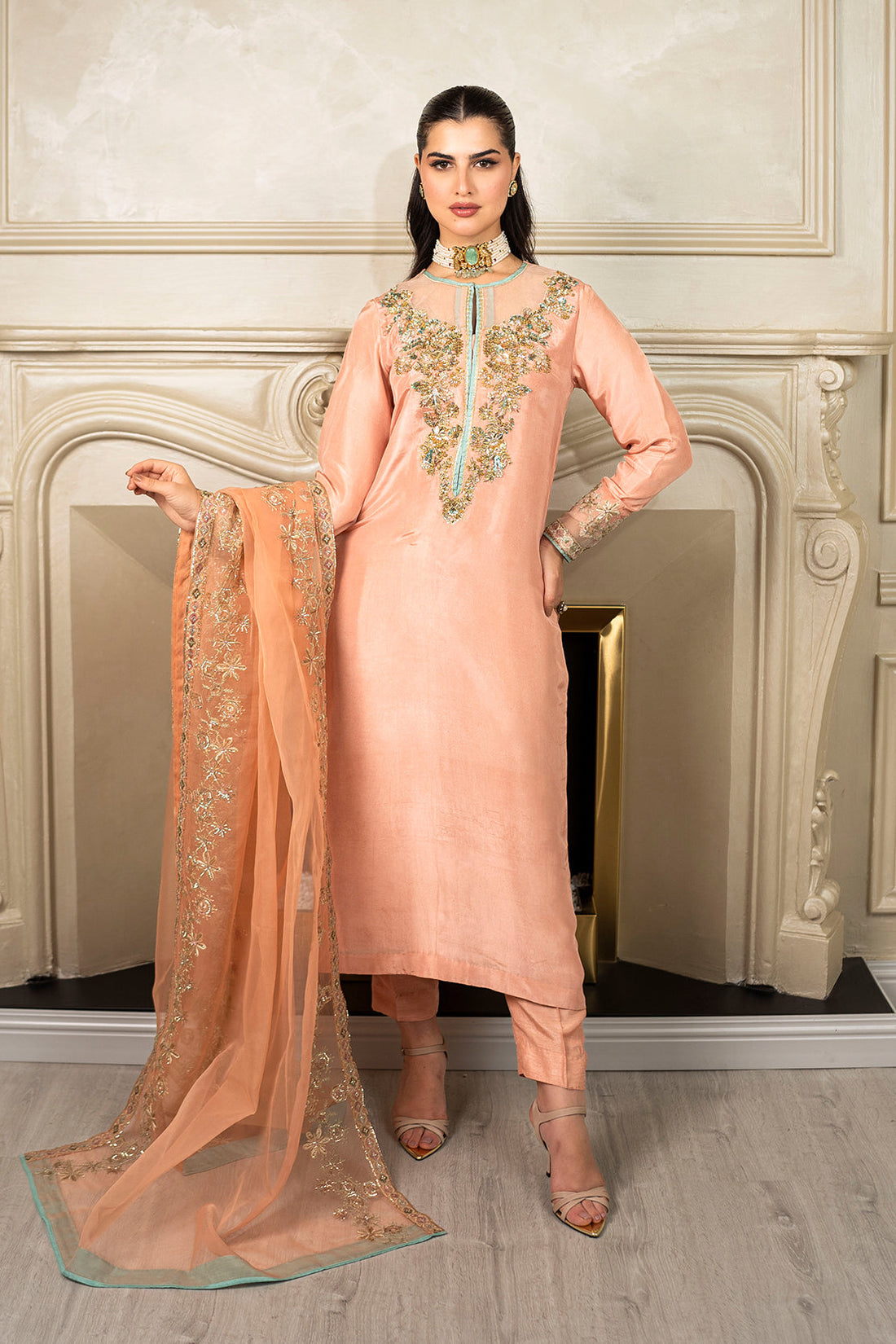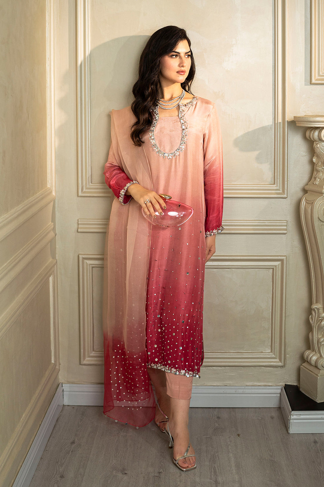Elsa" features a chic mid-length kameez crafted from pure sheesh silk, perfectly complemented by a...