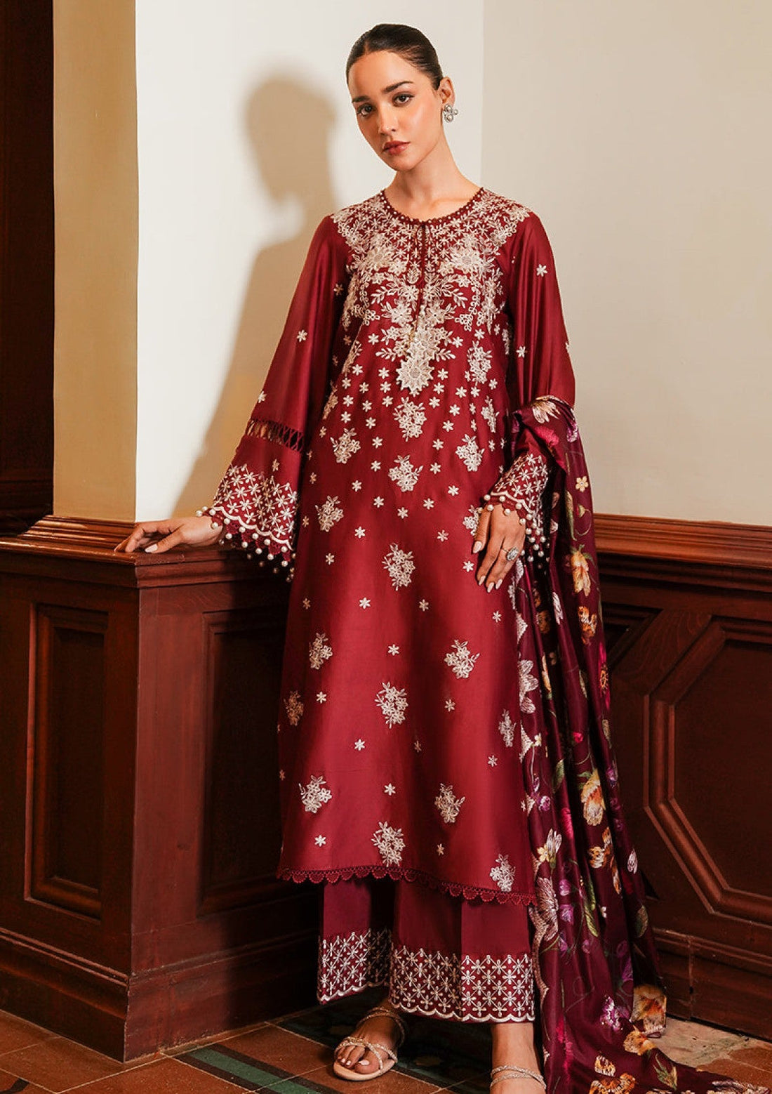 Outfit Type: Eastern Style: Long Shirt Color Type: Maroon Package Includes: 3 Piece Top ,...