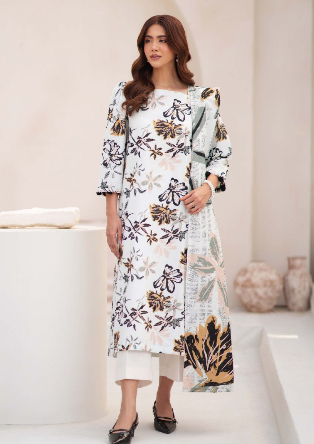 Outfit Type: Eastern Style: Long Shirt Color Type: Off White Package Includes: 3 Piece Top...