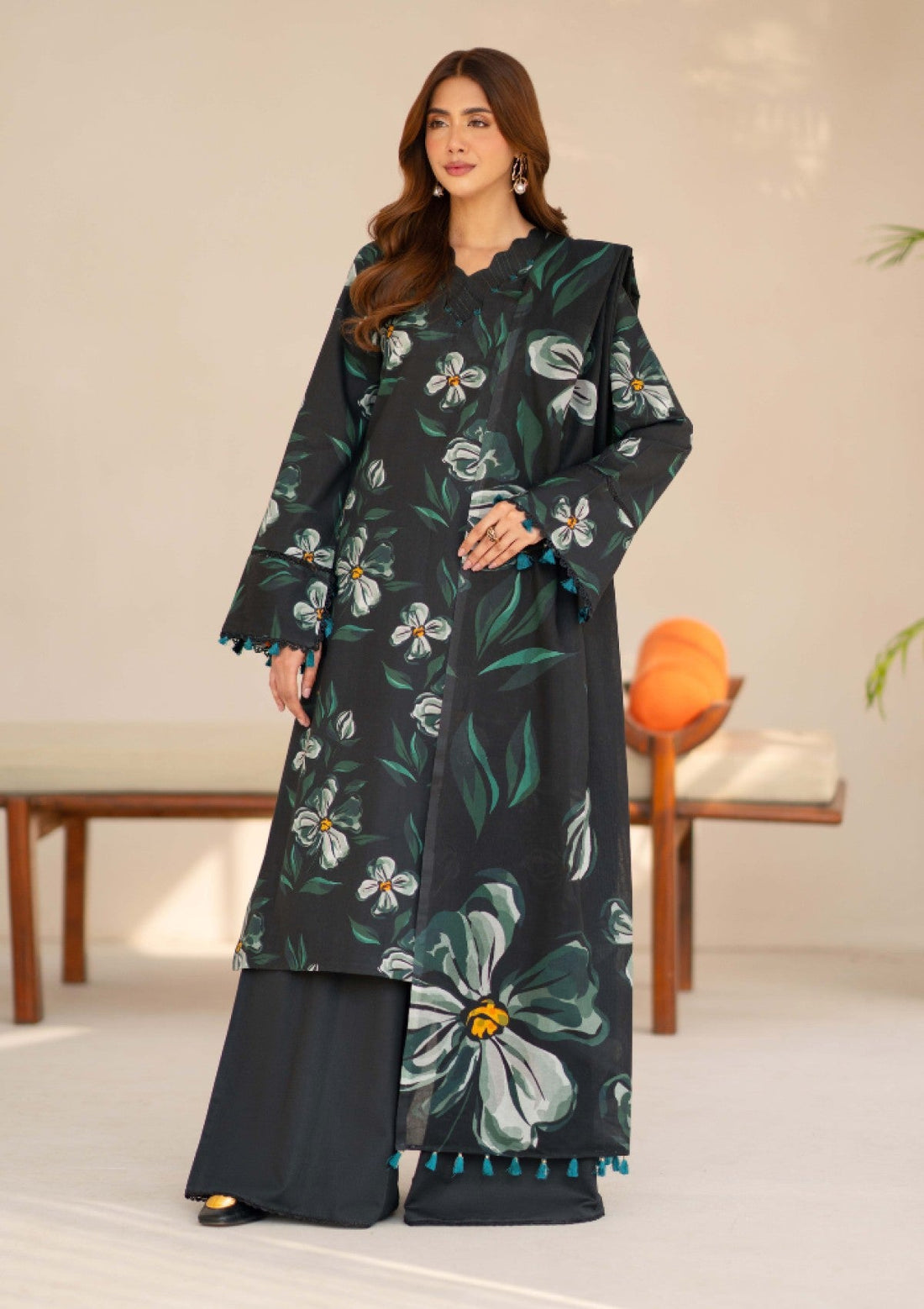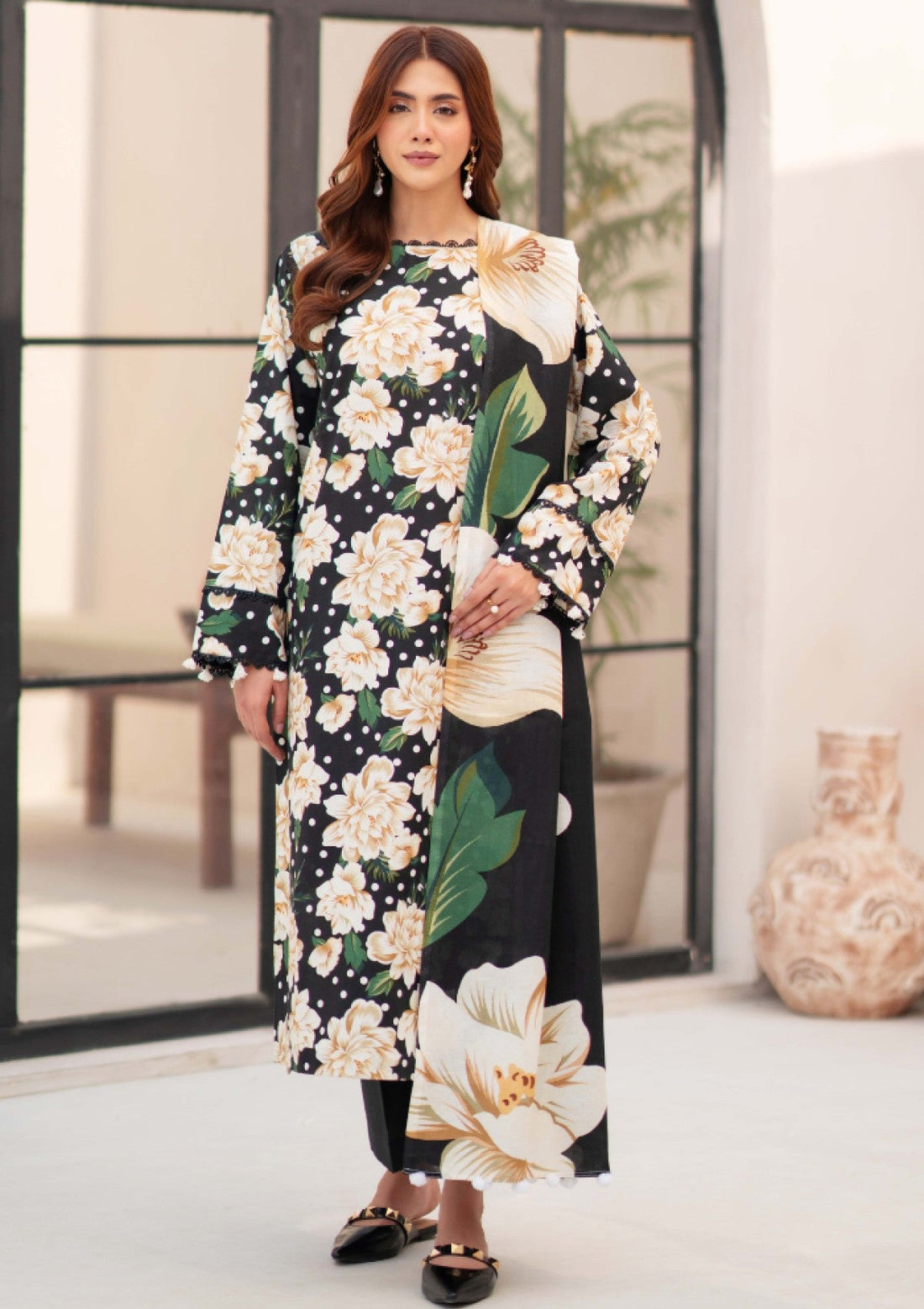 Outfit Type: Eastern Style: Long Shirt Color Type: Black Floral Package Includes: 3 Piece Top...