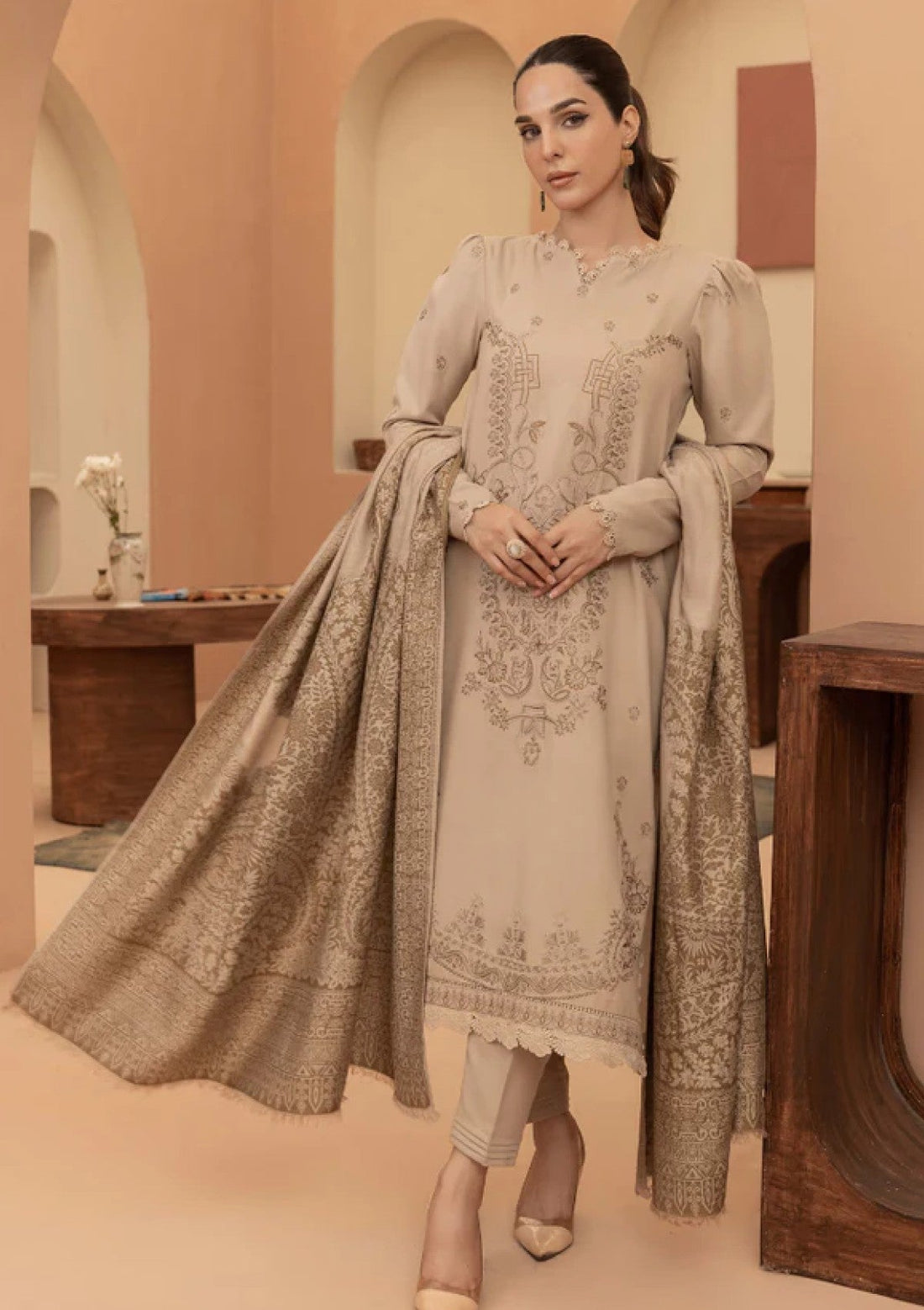 Outfit Type: Eastern Style: Long Shirt Color Type: Beige Package Includes: 3 Piece Top ,...