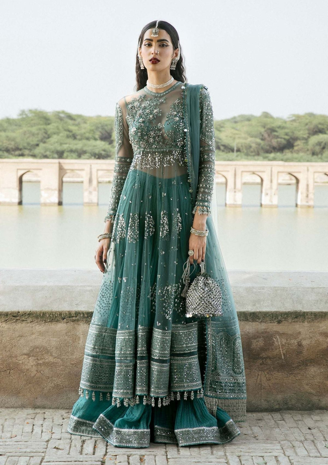 Description: Color:Teal Blue Fabric: Dupatta: Net Peshwas: Net Sharara: Silk Product Description: Embroidered Dupatta (Net)...