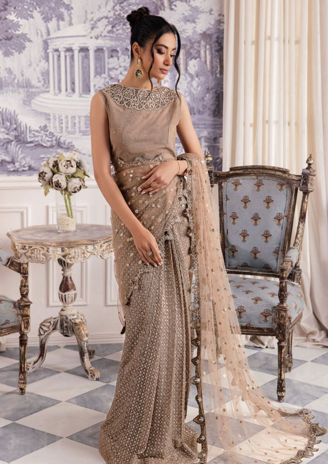 Outfit Type: Eastern Style: Saree Color Type: Skin Package Includes: 3 Piece Top , Bottom...
