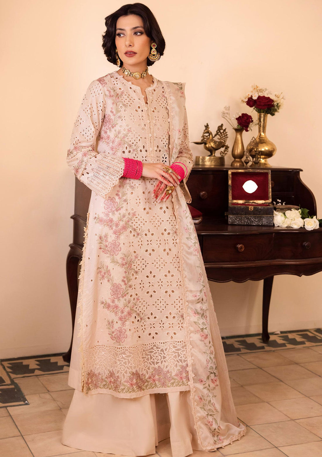 Outfit Type: Eastern Style: Frock Color Type: Cream Package Includes: 3 Piece Top , Bottom...