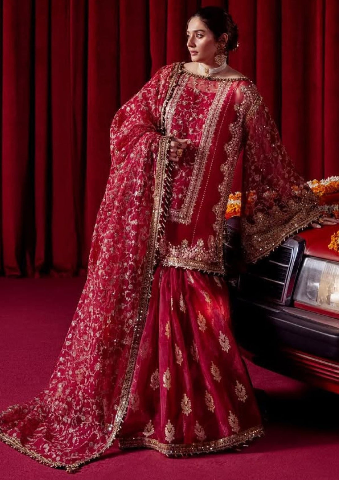 Outfit Type: Eastern Style: Gharara Color Type: Annari Red Package Includes: 3 Piece Top ,...