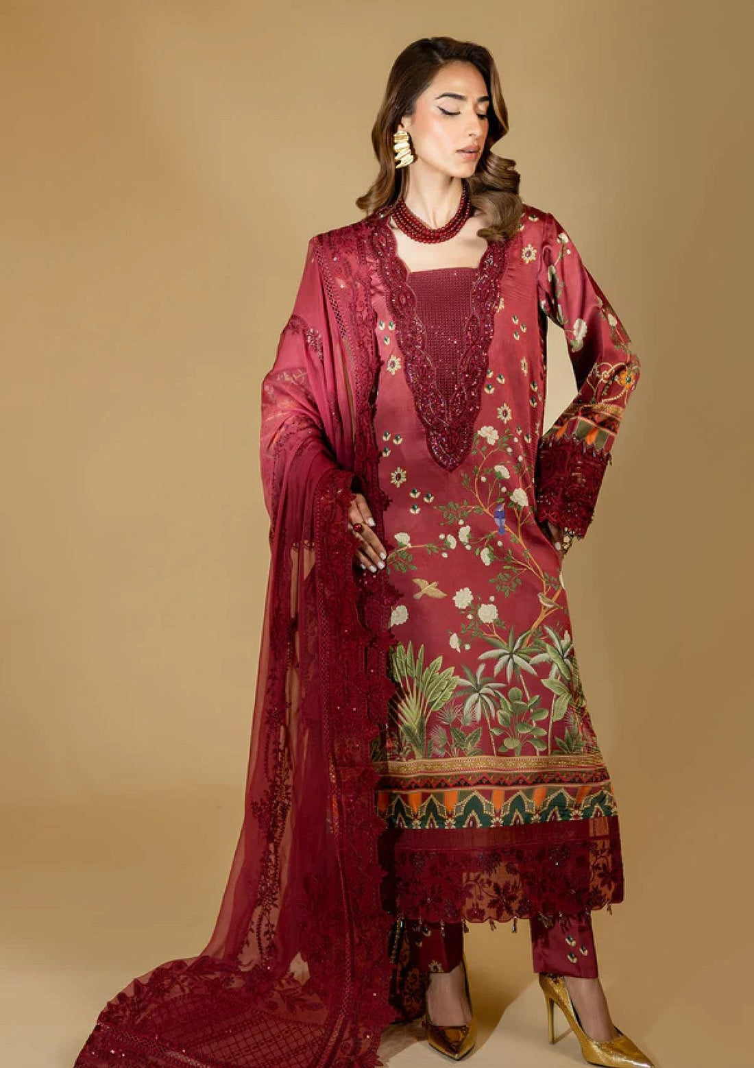 Outfit Type: Eastern Style: Long Shirt Color Type: Mehroon Package Includes: 3 Piece Top ,...