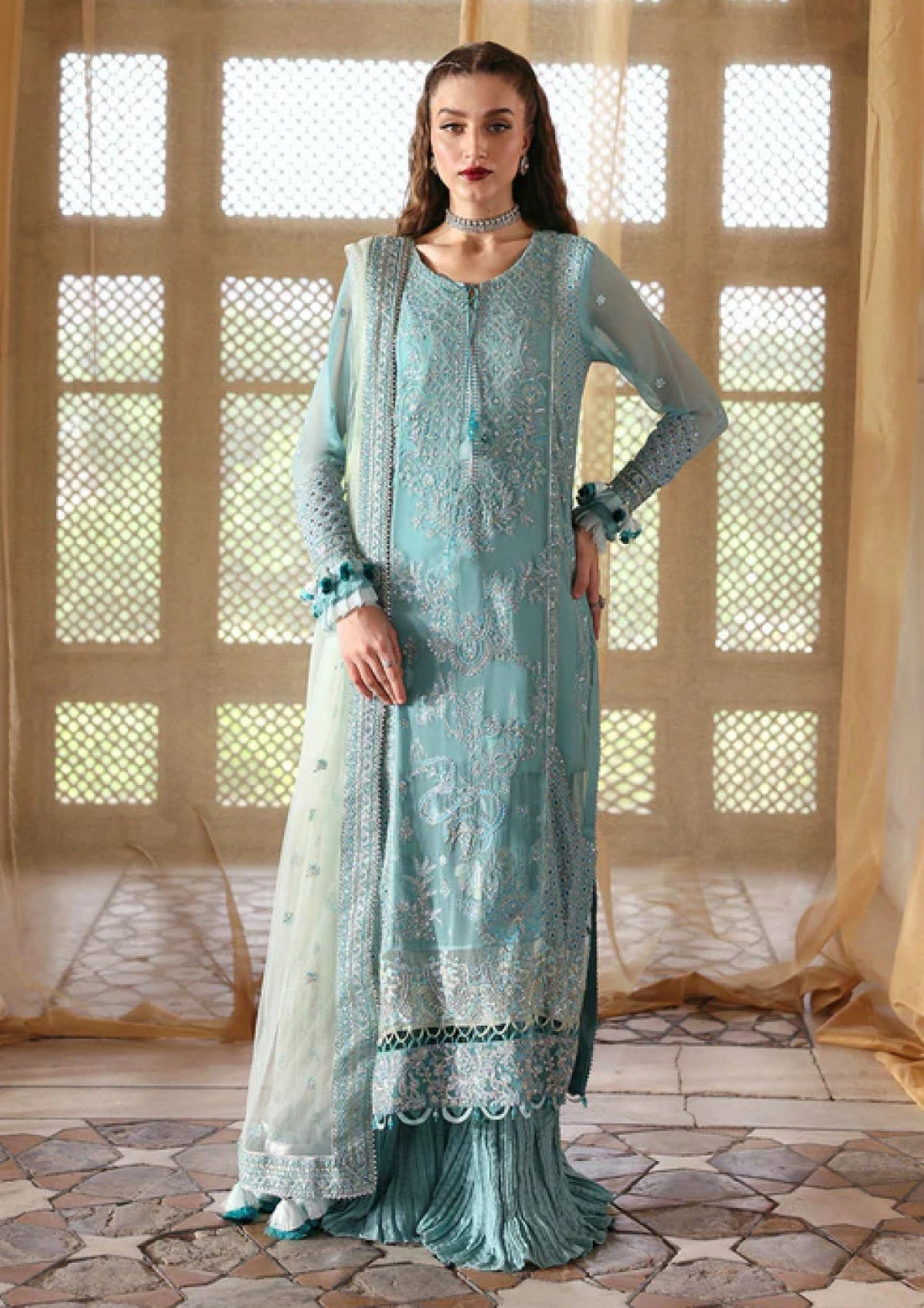 Outfit Type: Eastern Style: Gharara Color Type: Aqua Package Includes: 3 Piece Top , Bottom...
