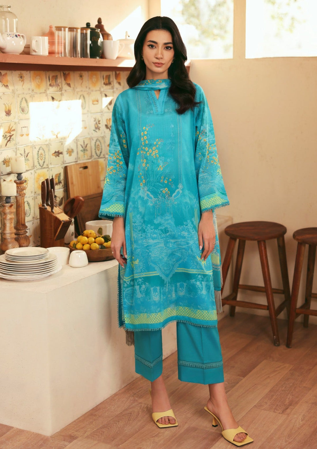 Outfit Type: Eastern Style: Long Shirt Color Type: Ferozi Package Includes: 3 Piece Top ,...