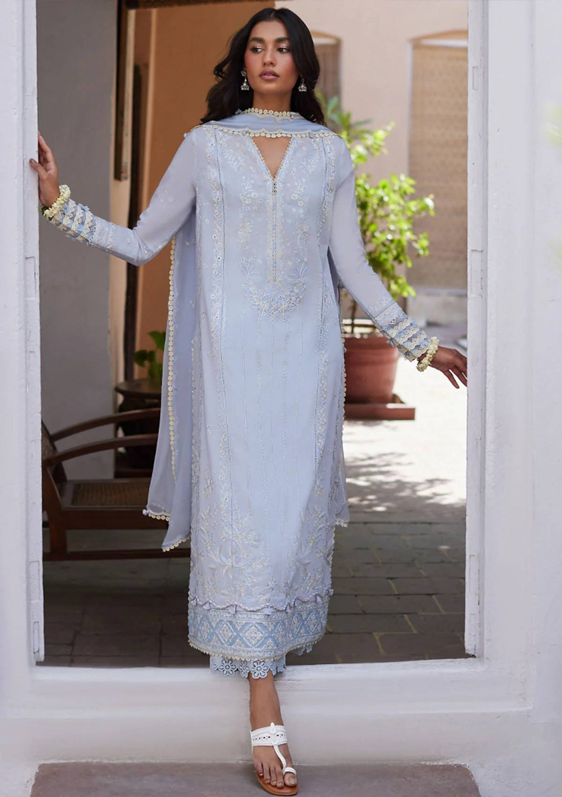 Outfit Type: Eastern Style: Long Shirt Color Type: Sky Blue Package Includes: 3 Piece Top...