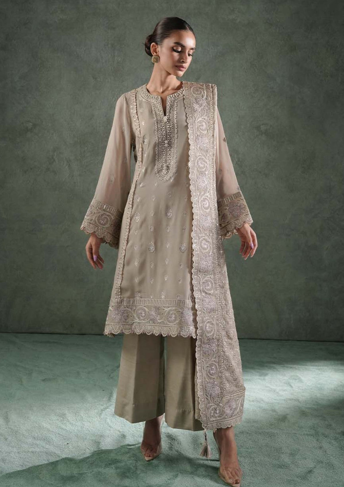Outfit Type: Eastern Style: Kurta Set Color Type: Oyster Grey Package Includes: 3 Piece Top...