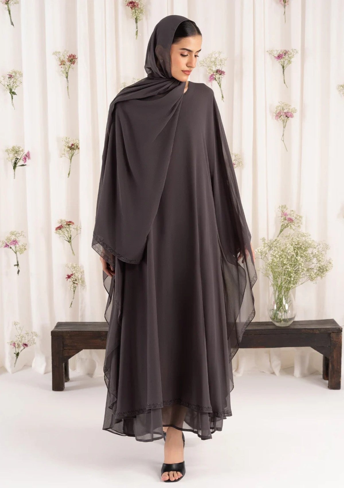 - Experience effortless style with our grey high multi chiffon abaya. This flowy, breezy set features elegant stonework on both the abaya and the scarf, making it perfect for any occasion.