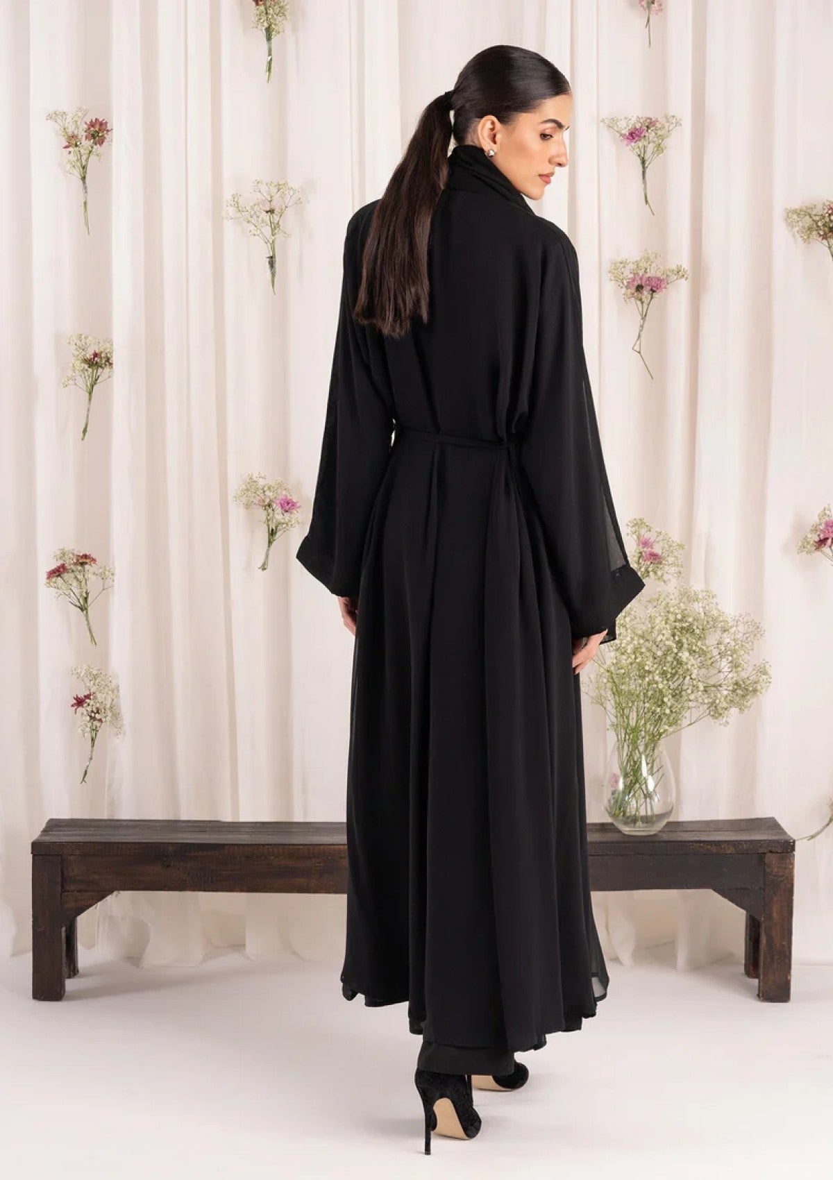 - Define your silhouette with our black high multi chiffon abaya, featuring a stylish front belt for a flattering shape. Complemented by a nida inner slip and a formal chiffon scarf