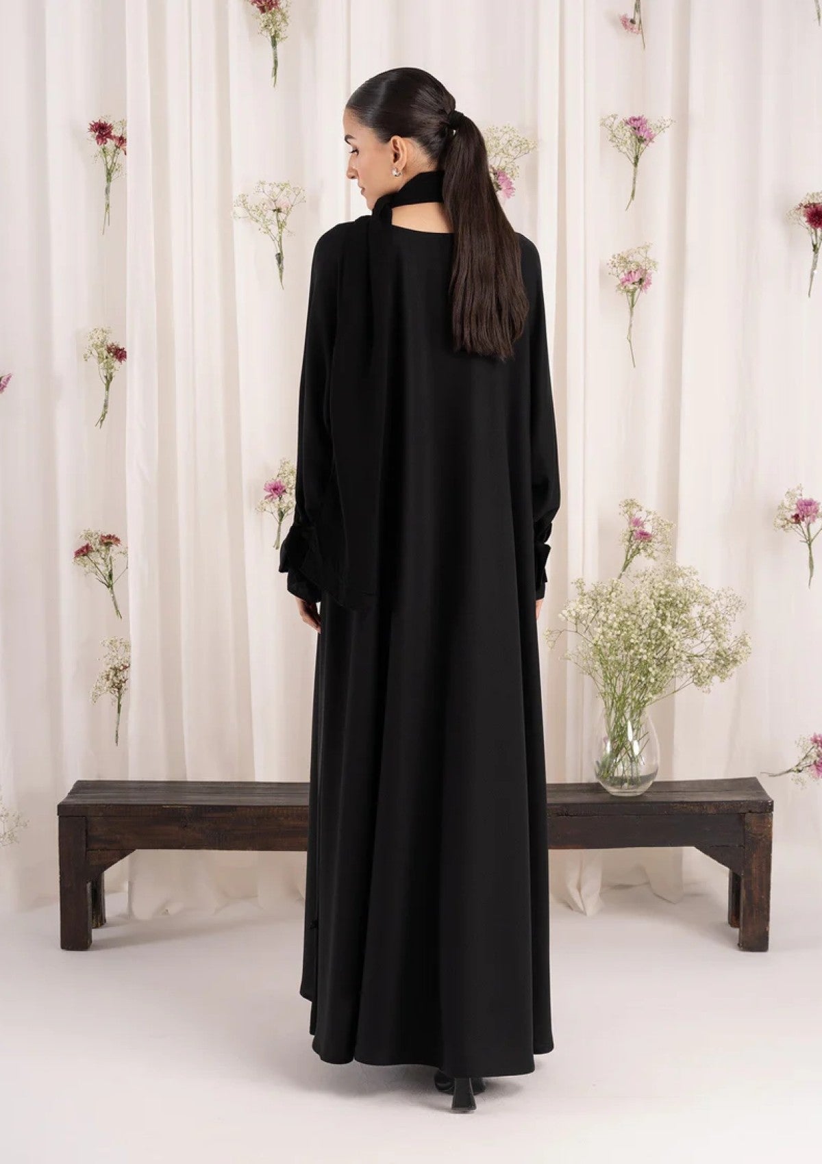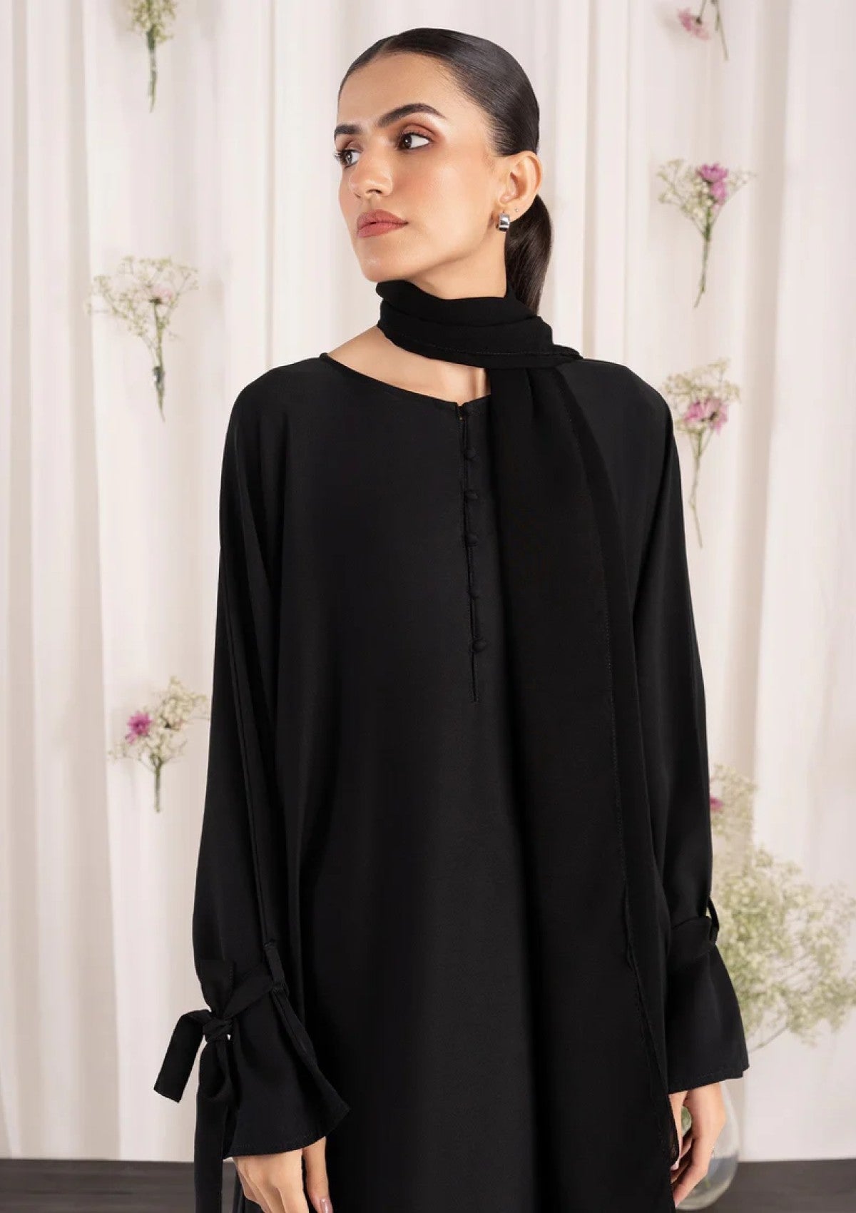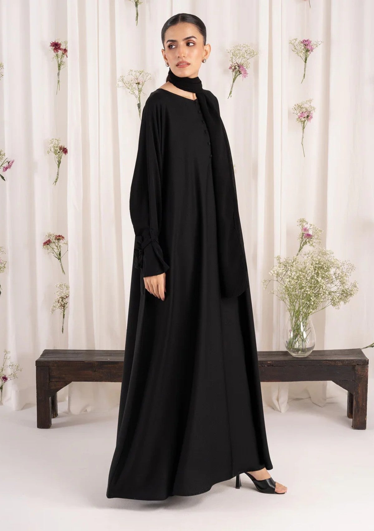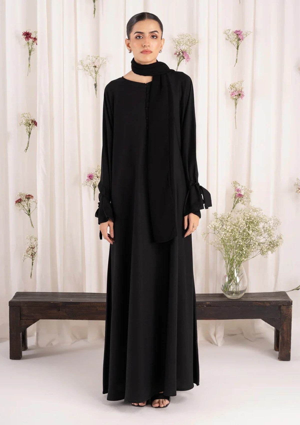 - Add a charming touch with our black nida abaya, featuring cute bow details on the sleeves, paired with a formal chiffon scarf