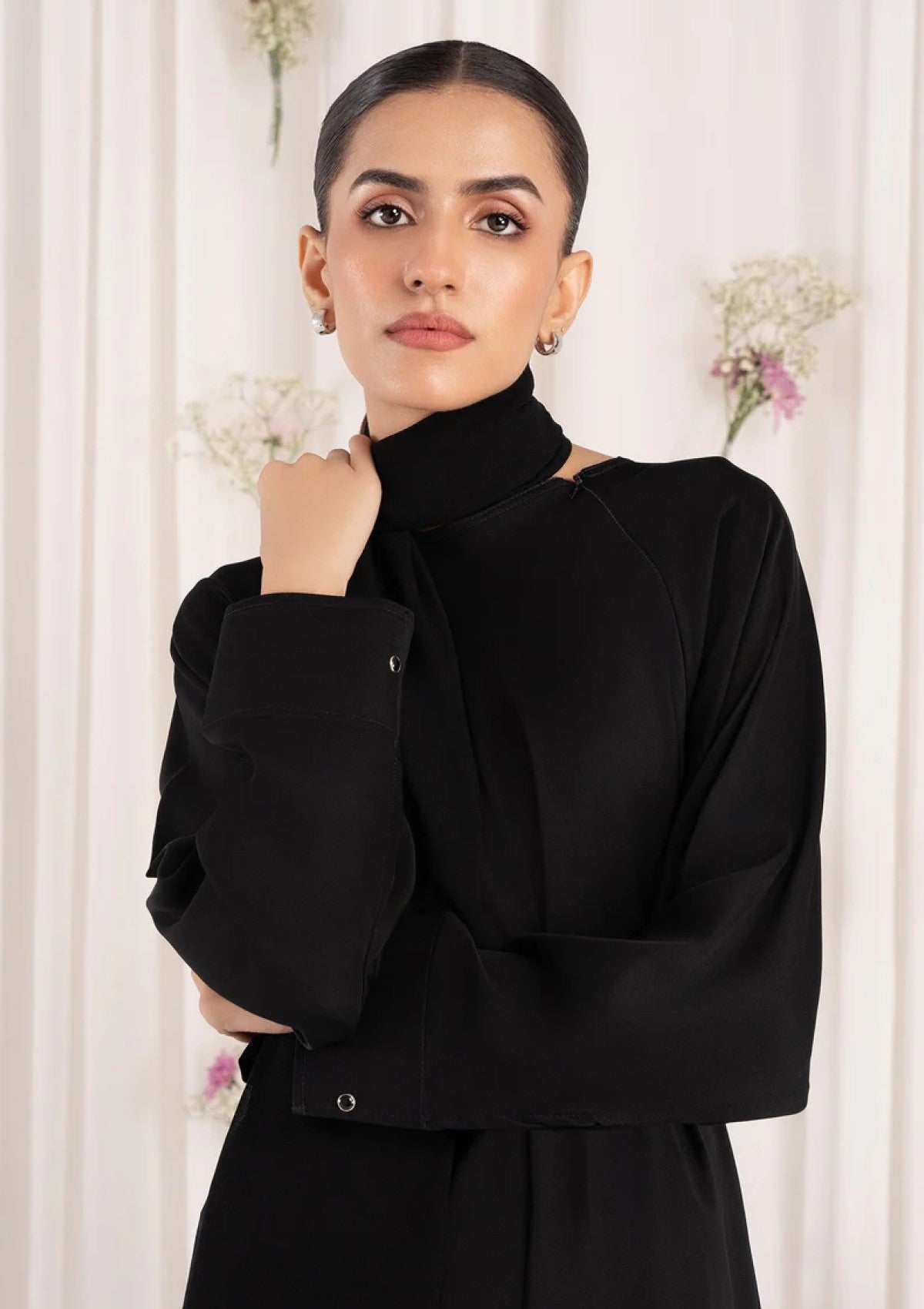 - Update your wardrobe with our black nida abaya, featuring a stylish front zip design and a belt to tie the look together. Paired with a formal chiffon scarf, this ensemble combines modern flair with classic elegance.