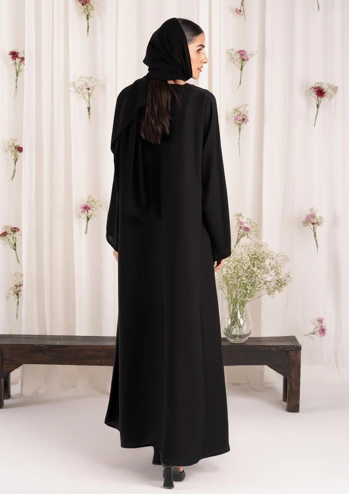 - Experience effortless elegance with our black nida abaya, designed for a beautiful, flowing silhouette, paired with a formal chiffon scarf.