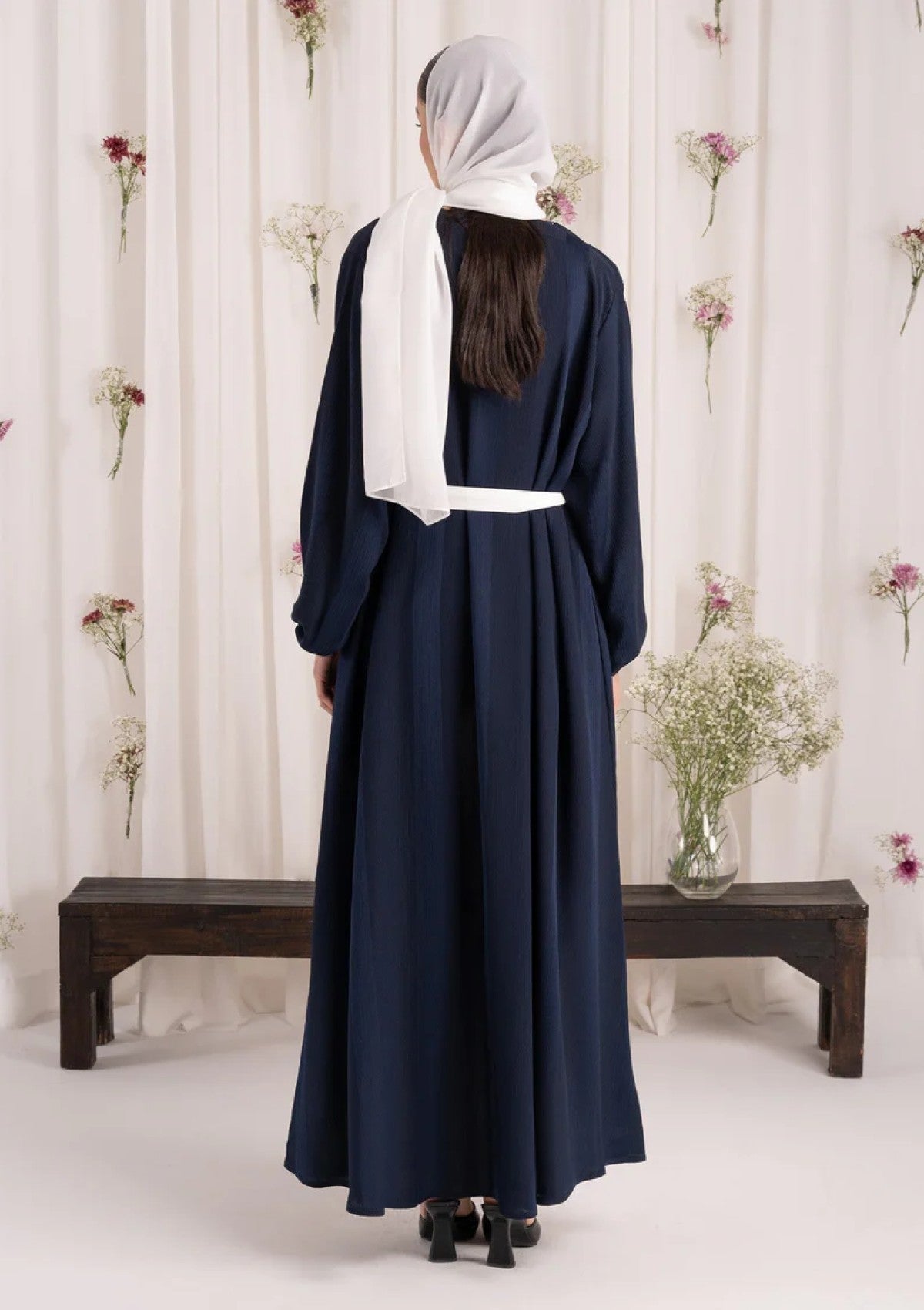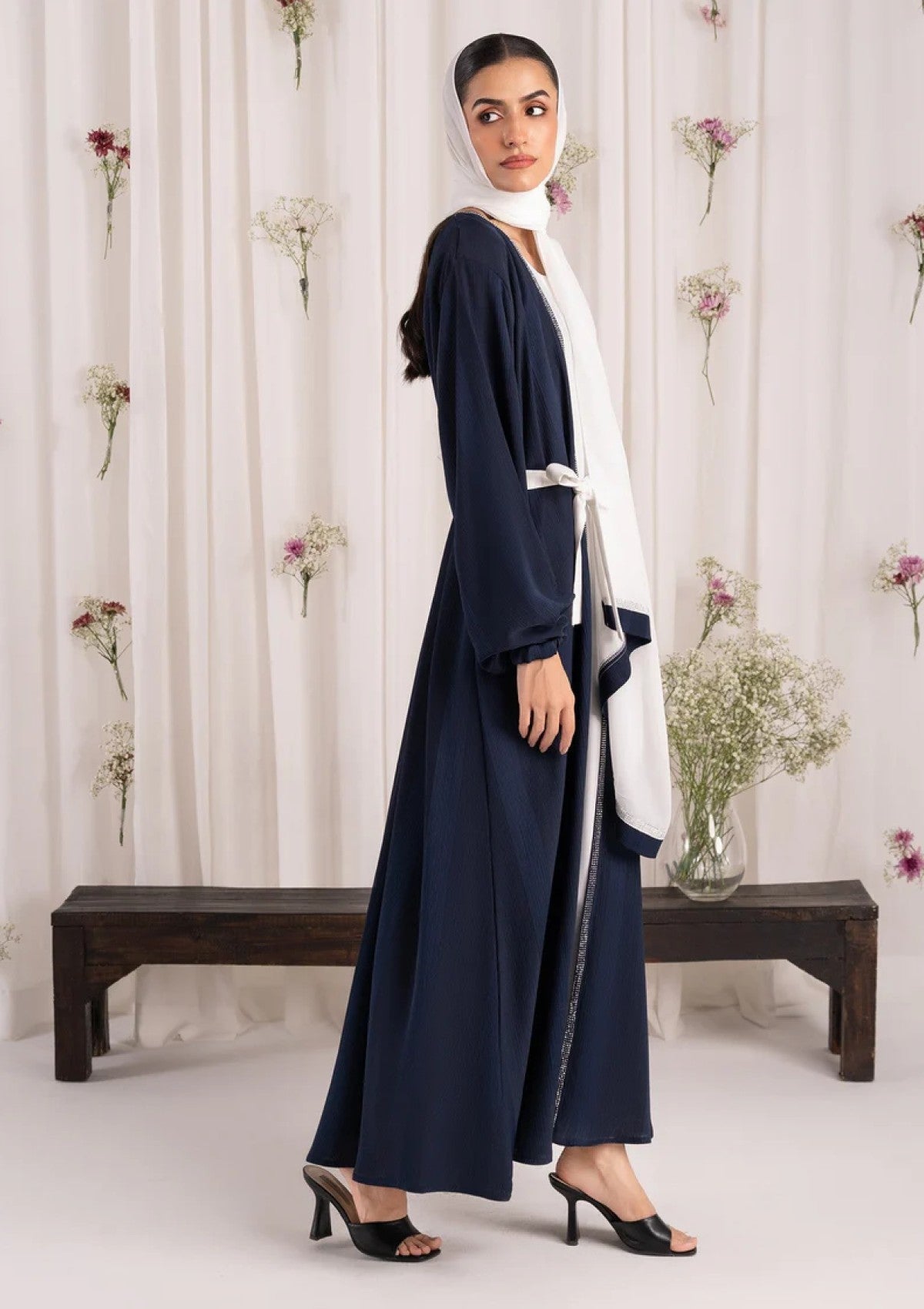 - Embrace sophistication with our navy blue print Zoom Nida abaya, featuring elegant stonework details and a graceful flow.
