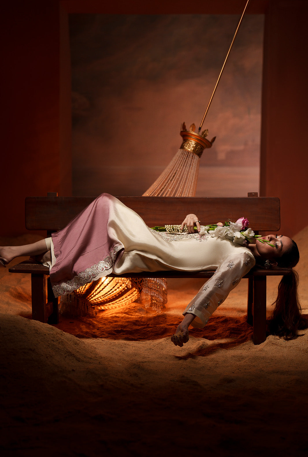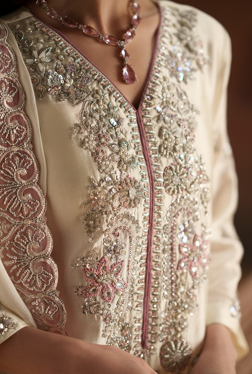 The look is completed with a silk embroidered dupatta, bringing subtle grace and festive charm.