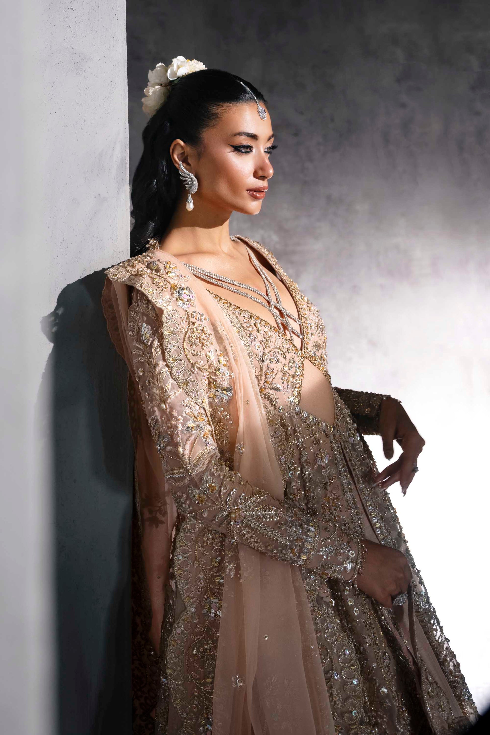 Step into modern royalty with this glamorous blush-toned bridal ensemble by Akbar Aslam. The gown features a statement criss-cross neckline that adds a bold twist to its otherwise regal silhouette, adorned with delicate embroidery, sequins, and mirror work. Intricate embellishments trail down the full-length sleeves and flare gracefully into a voluminous skirt, offering a radiant blend of traditional artistry and contemporary design. Finished with a scalloped dupatta and a beaded pouch, this look is ideal for the bride who dares to be distinctive while embracing classic bridal elegance.