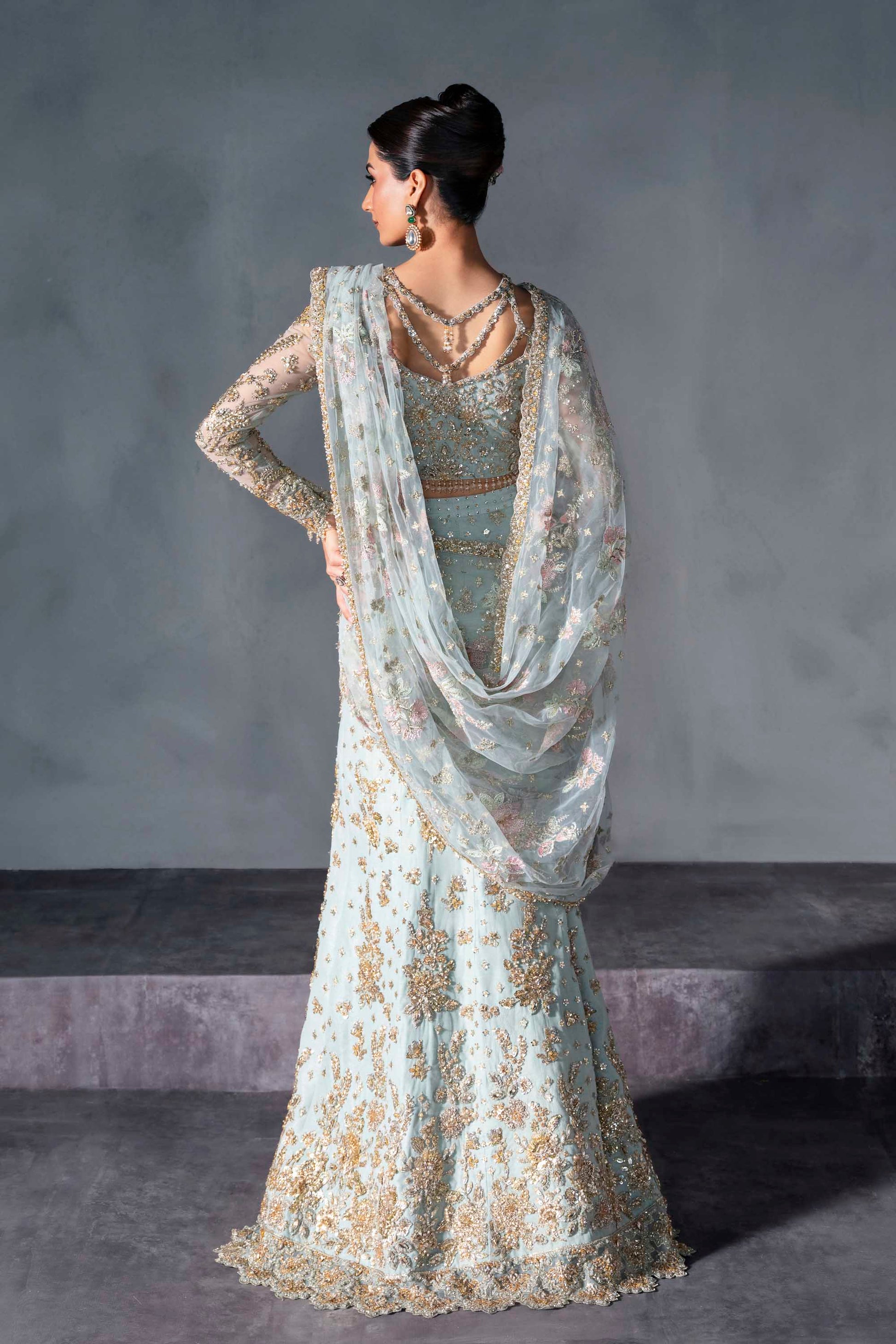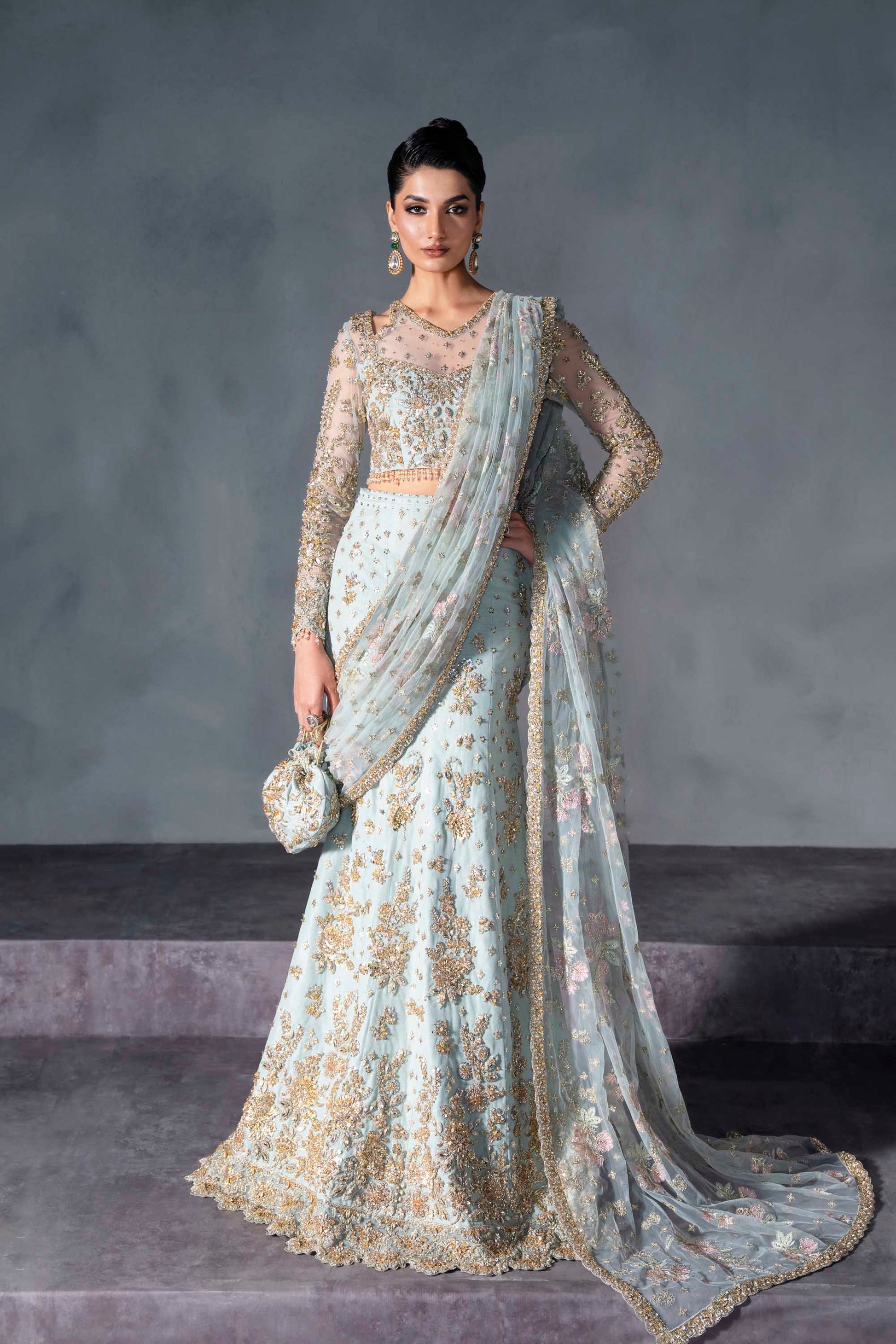 Exude refined elegance in this powder blue bridal lehenga by Akbar Aslam, designed for the bride who dares to be different. The ensemble features a delicately hand-embellished choli with sheer sleeves and soft floral motifs, paired with a graceful lehenga adorned in golden embroidery and sequin detailing. A flowy net dupatta with pastel floral accents adds a romantic dimension, while the matching handcrafted pouch completes the ethereal look. Light, dreamy, and modern—this design is perfect for daytime celebrations and intimate weddings.