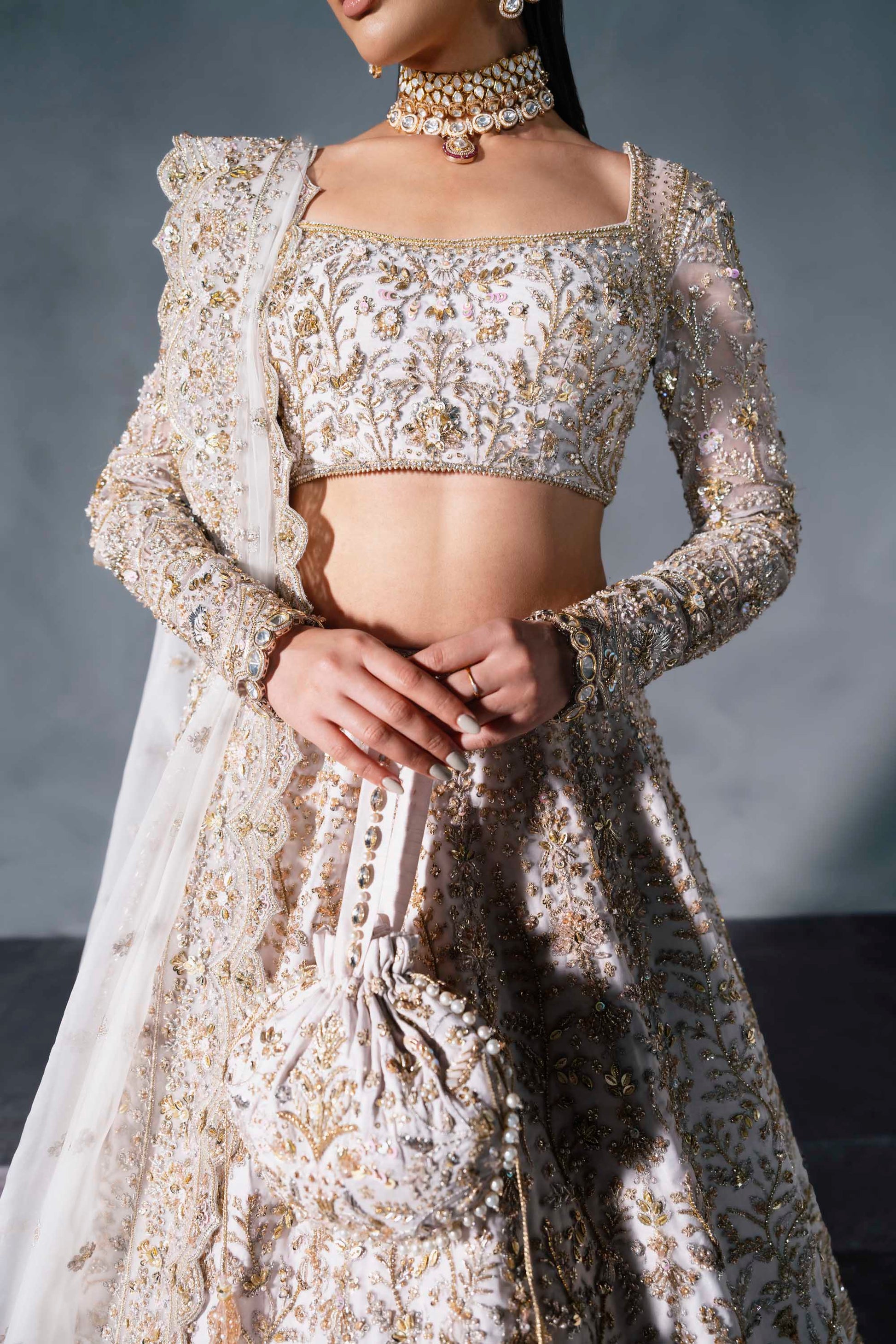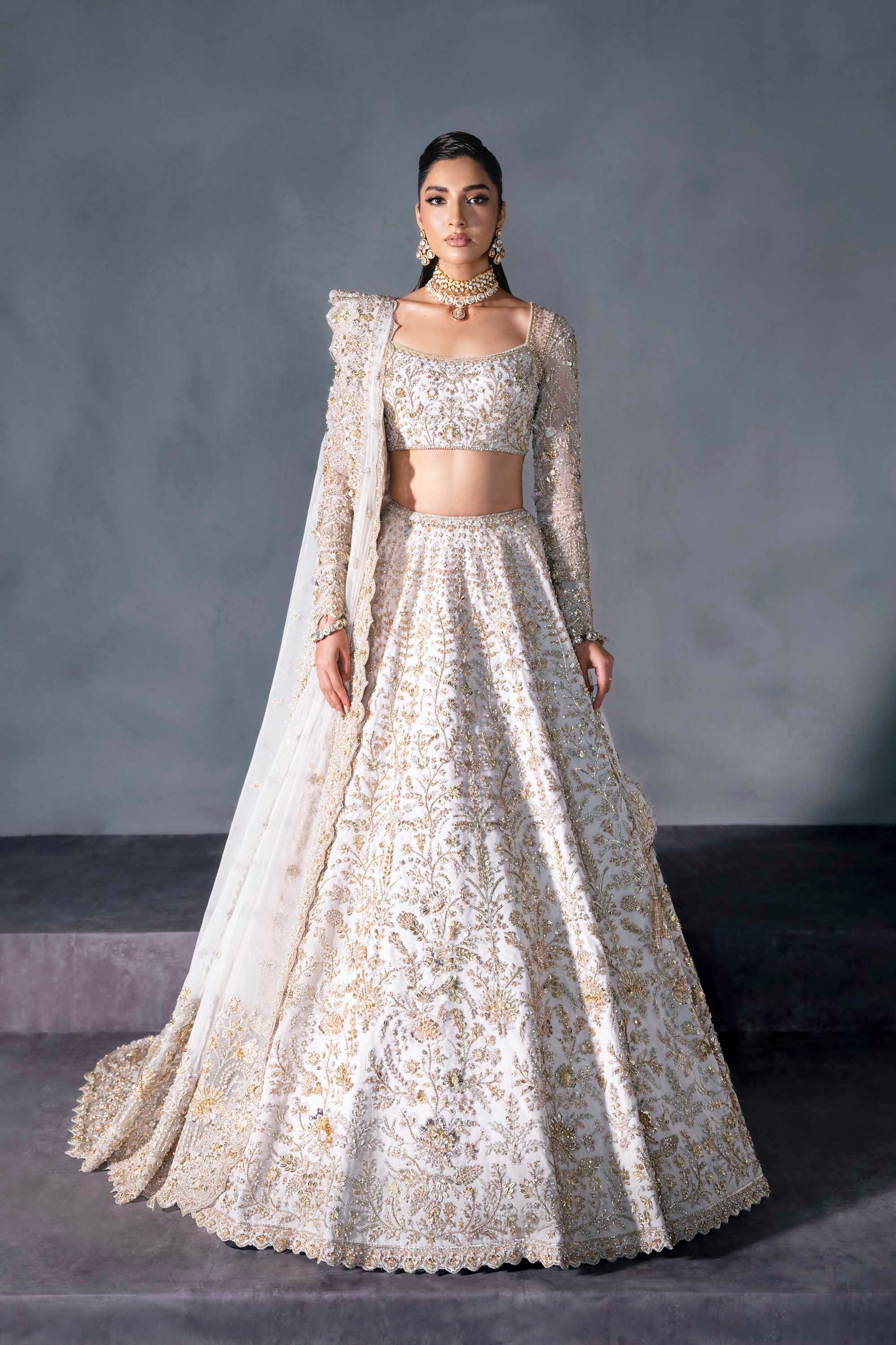 Grace meets grandeur in this ethereal white and gold bridal lehenga by Akbar Aslam. The look features a delicately embroidered choli with full-length sleeves, paired with a voluminous lehenga that blooms with intricate floral motifs in gold threadwork and hand embellishments. The ensemble is balanced with a sheer dupatta edged in finely detailed borders, creating a soft, romantic finish. Light, regal, and effortlessly elegant, this design is perfect for brides seeking a modern yet timeless look for their big day.