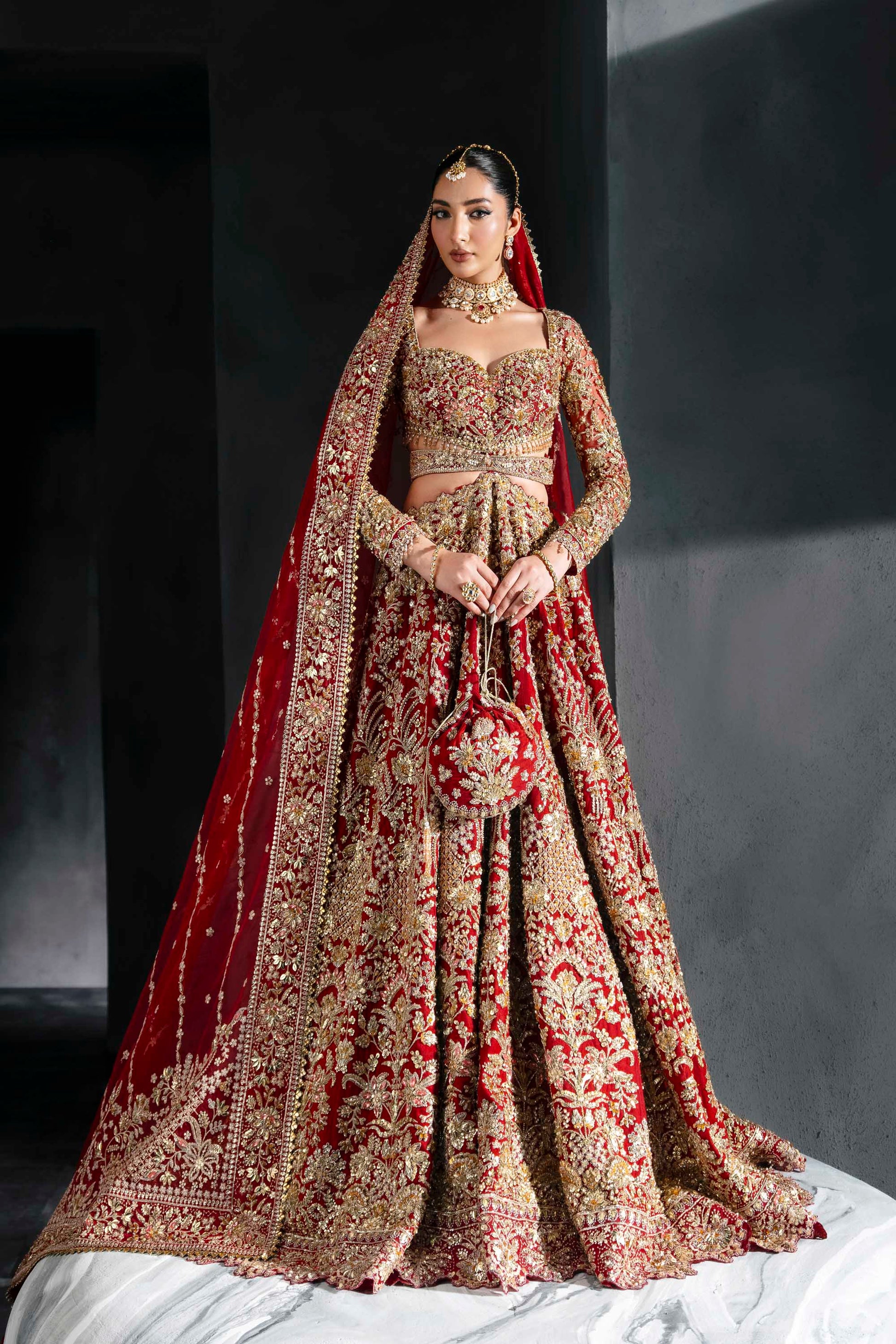 Celebrate tradition in its grandest form with this classic red bridal lehenga by Akbar Aslam. Lavishly adorned with intricate gold embroidery, resham detailing, and hand embellishments, the ensemble features a sculpted sweetheart neckline and full sleeves that balance structure with elegance. The voluminous lehenga showcases ornate floral and paisley motifs, while the heavily embroidered dupatta adds a majestic finish. Paired with a matching handcrafted pouch, this look is designed for the bride who embodies timeless grace and cultural richness on her big day.