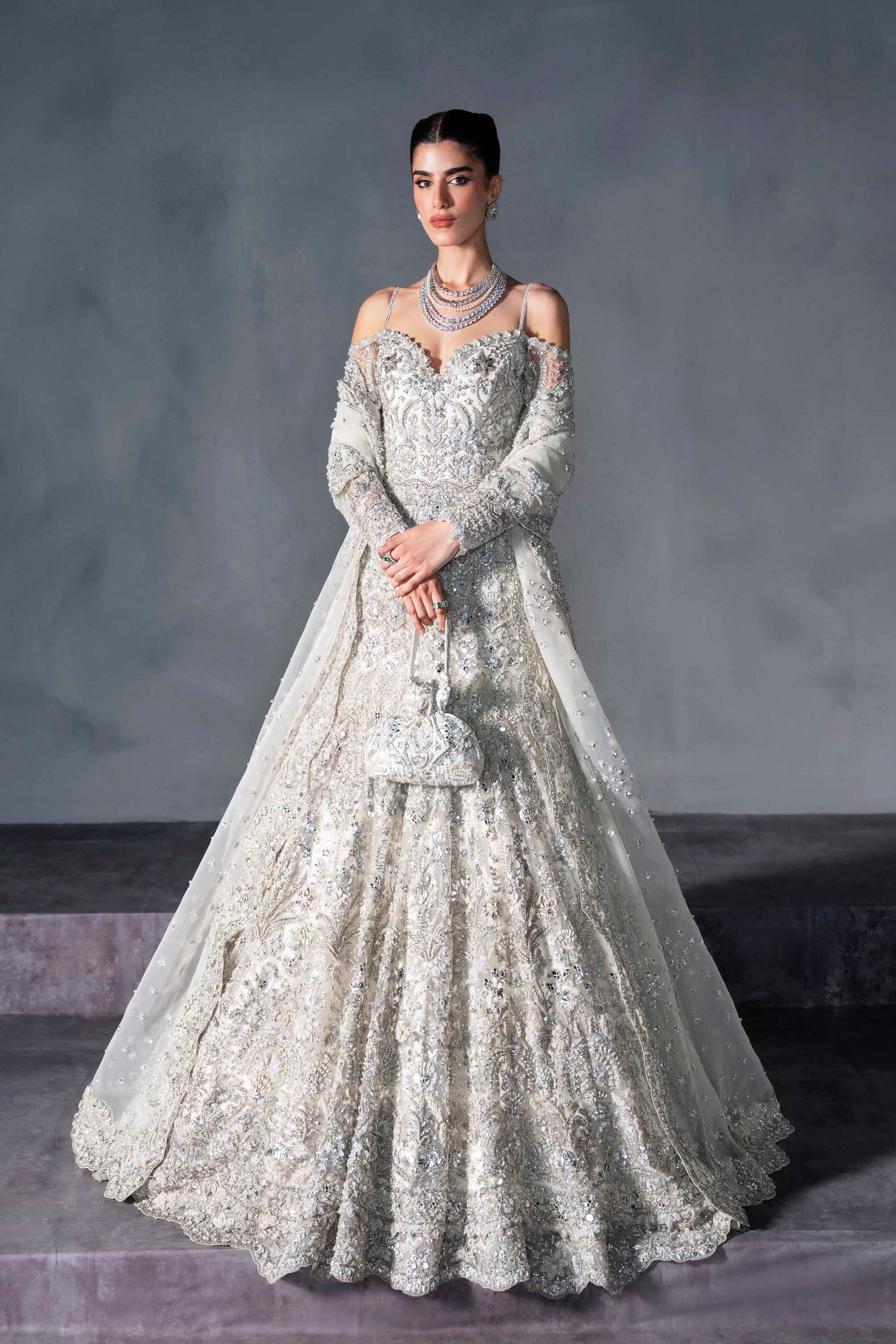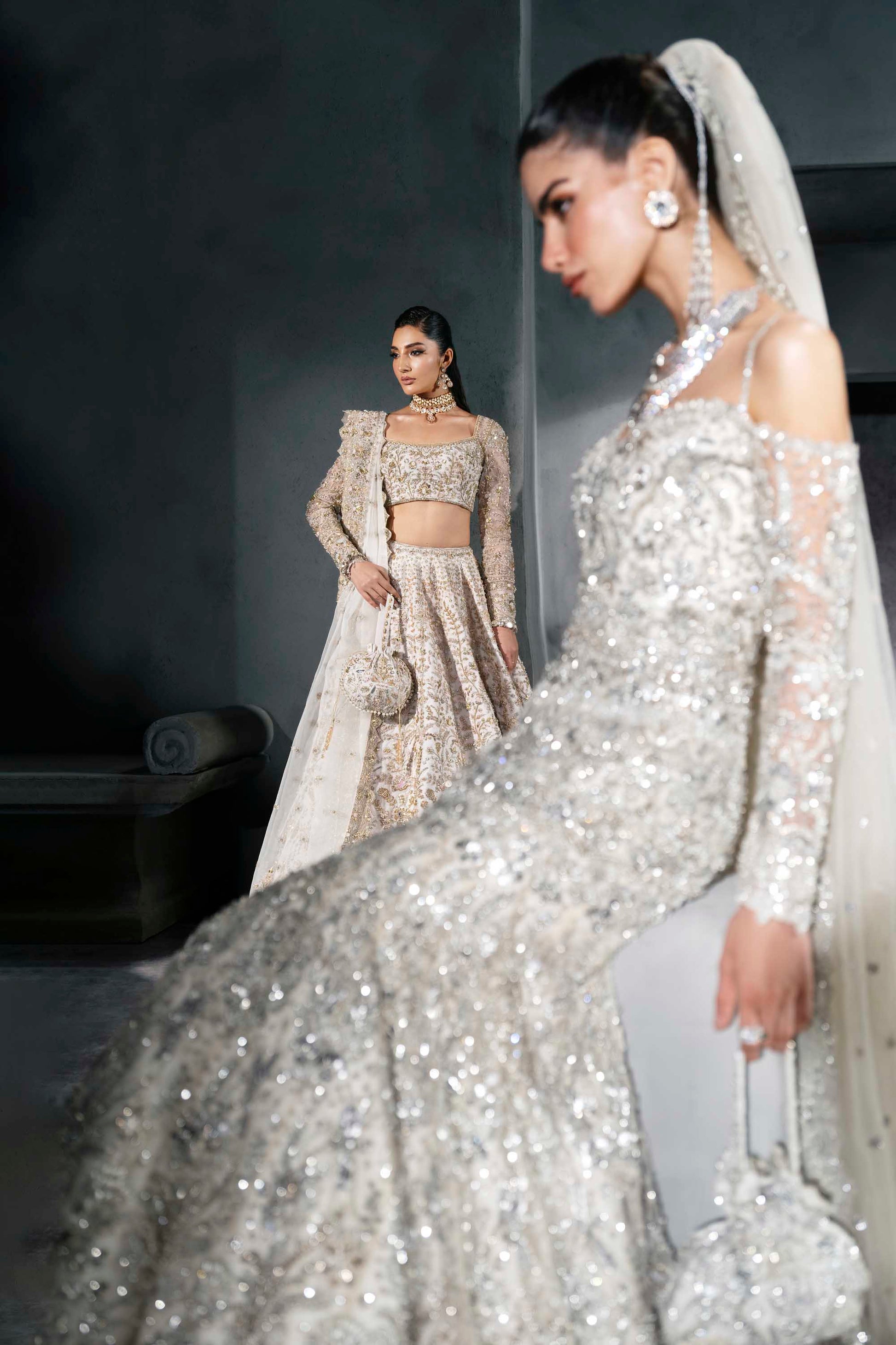 Make a breathtaking entrance in this ice-silver bridal lehenga by Akbar Aslam, where contemporary drama meets traditional artistry. The off-shoulder bodice with delicate straps is intricately hand-embellished with crystals, beads, and silver threadwork that flows seamlessly into a voluminous, fully flared skirt. A sheer net dupatta with ornate borders adds ethereal movement, while the coordinated embellished pouch completes the refined silhouette. Perfect for the bride who seeks a modern fairytale look with timeless bridal elegance.
