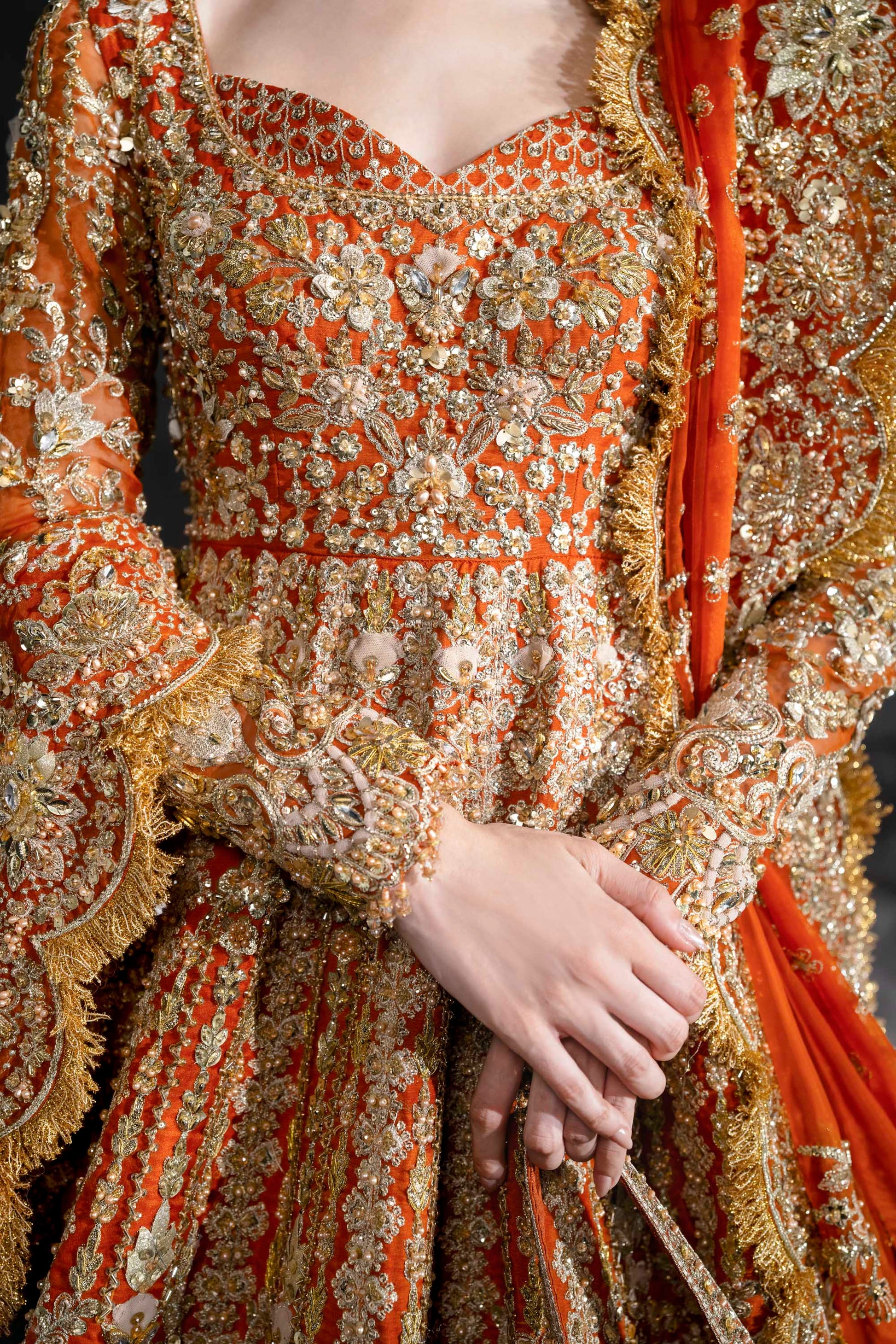 Radiate royal splendor in this vibrant orange bridal lehenga by Akbar Aslam, crafted for the bride who dares to make a bold statement. Featuring a structured neckline and full sleeves, the silhouette is drenched in intricate gold embroidery, hand embellishments, and traditional motifs that cascade into a grand flare. The heavily worked dupatta, edged with ornate scalloping, adds depth and drama to the ensemble. Finished with a matching handcrafted pouch, this look is an ode to cultural richness, perfect for a powerful and unforgettable bridal presence.