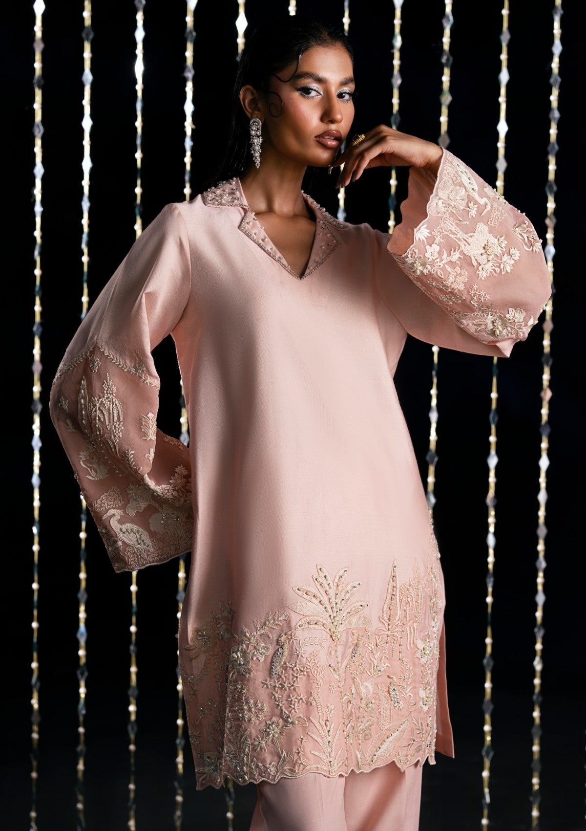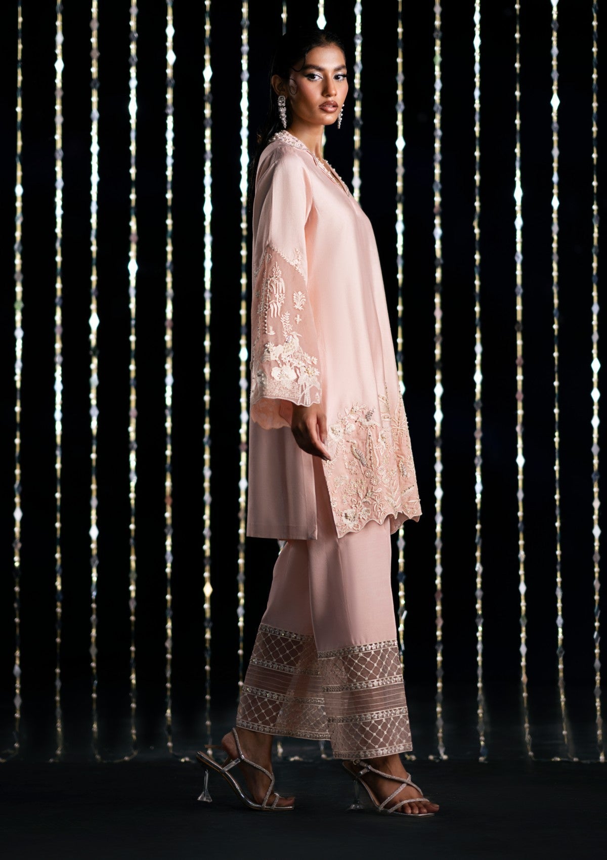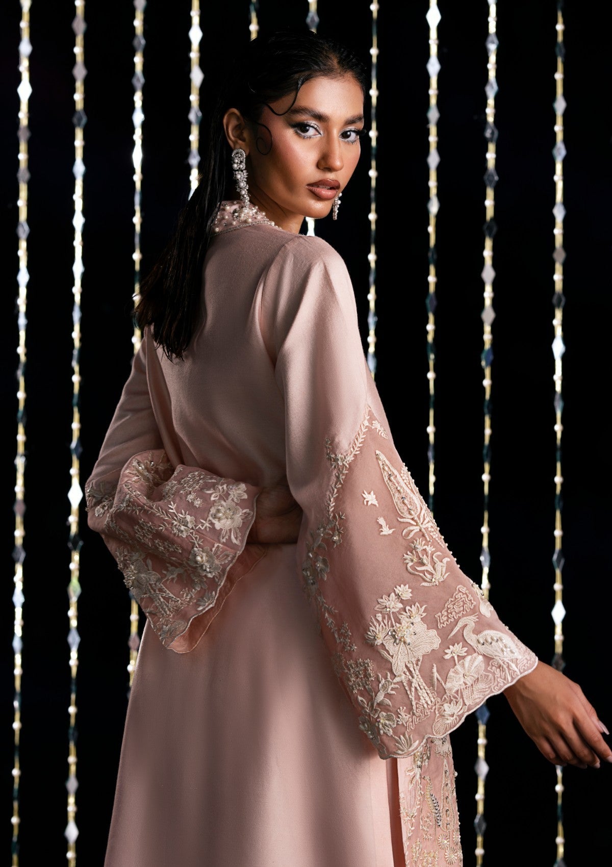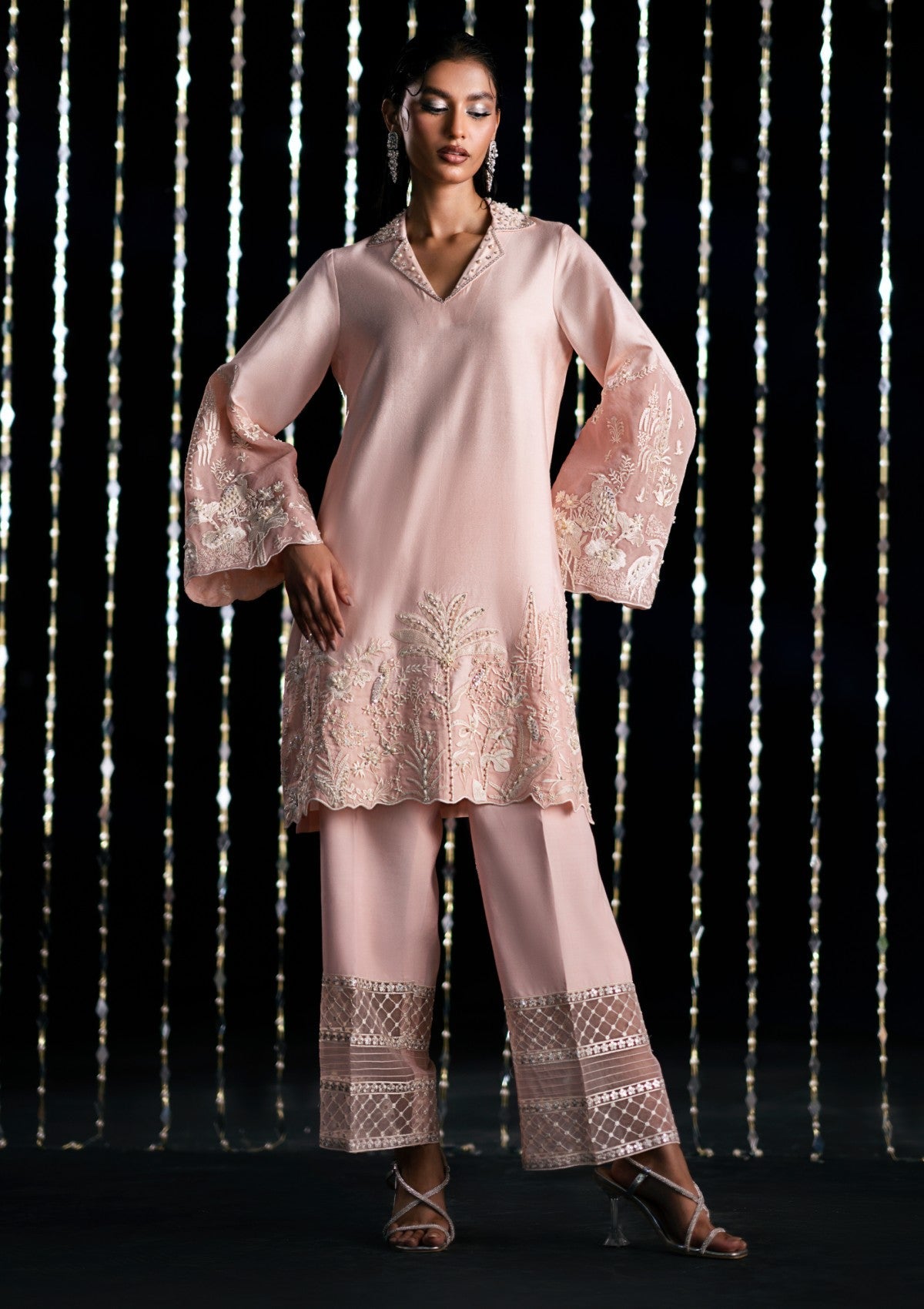 The Nude Pink outfit features a collar adorned with elegant embellishments of sequins and crystals. The hem showcases intricate, nature-inspired embroidery, highlighted by shimmering sequins and crystals. The sleeves are similarly embellished, creating a cohesive and sophisticated design. Completing the look, the Azar pants are elegantly finished with a sequined embroidered border.
