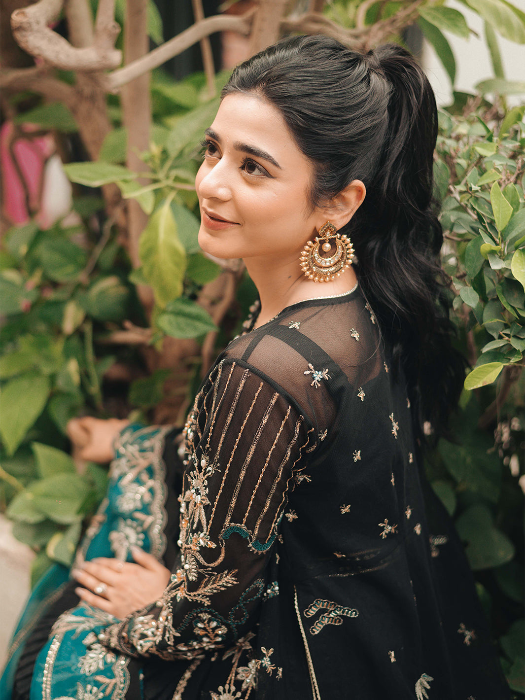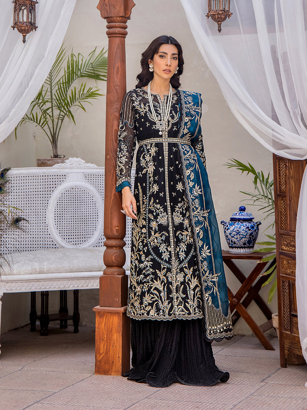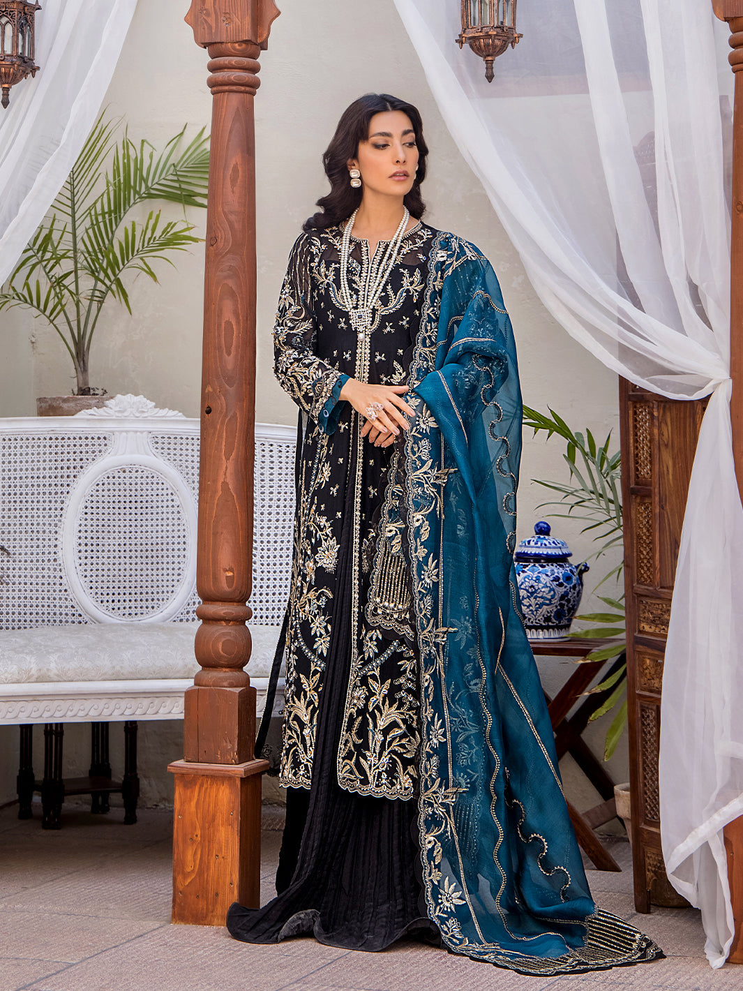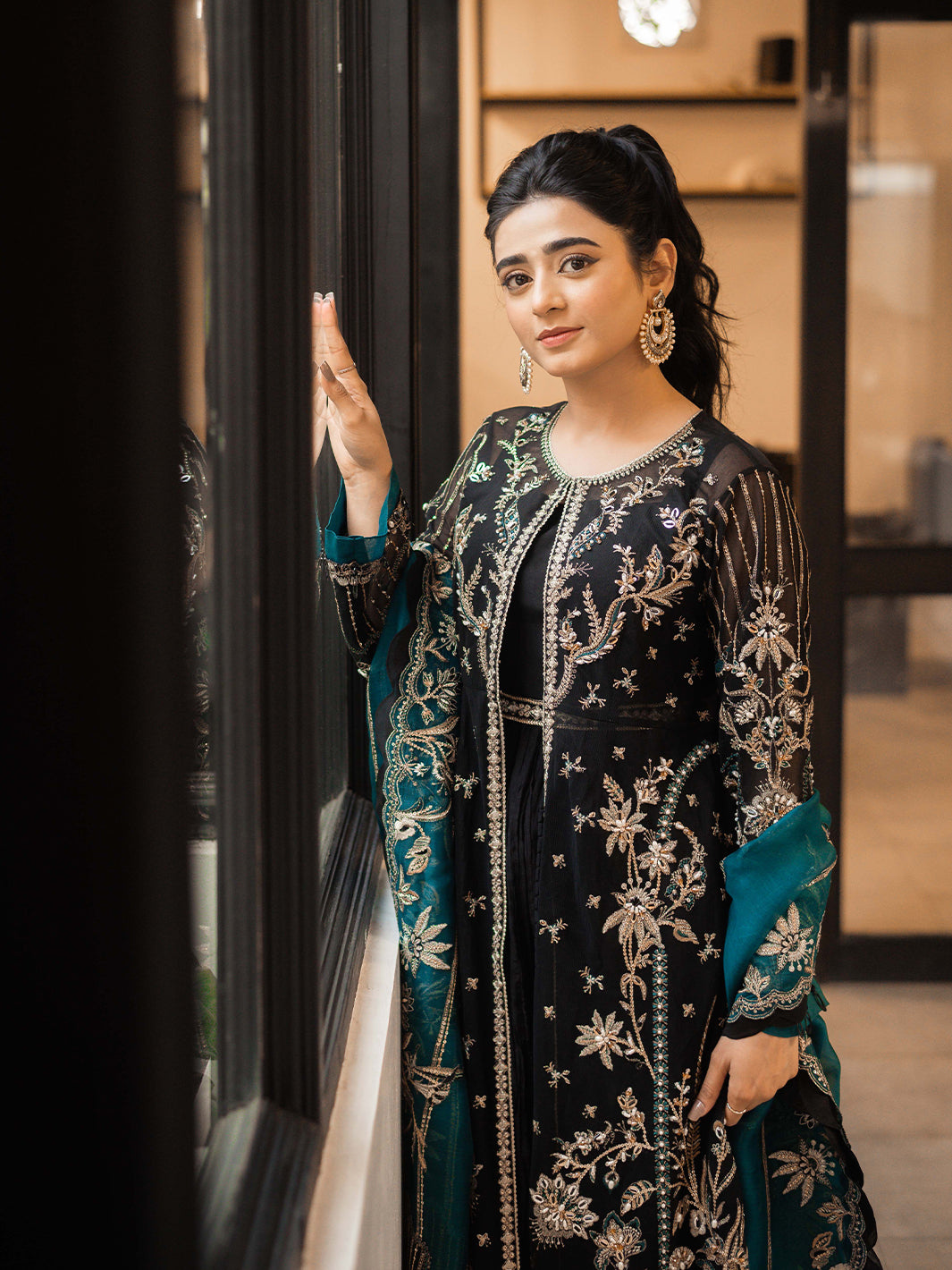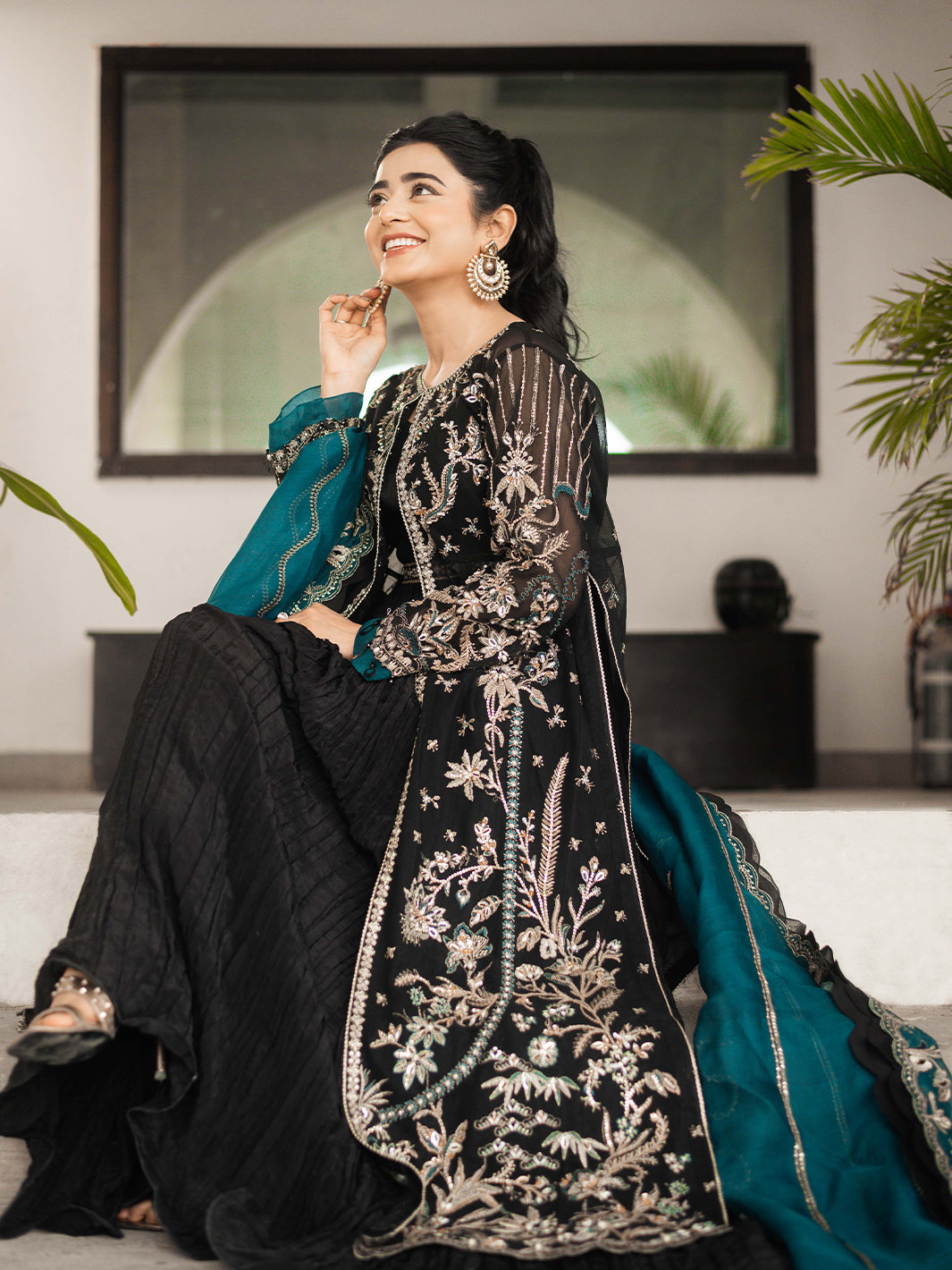 Rendered in black; this exquisite ensemble is crafted with utmost precision to details. This alluring outfit features botanical embroideries accentuated with gold, silver and black hand embellishments artistically worked all over. Paired with a crushed maxi and organza dupatta crafted in a surreal shade of teal blue which is framed with a scalloped embroidered border. This outfit is a must-have for all the soirees this season.