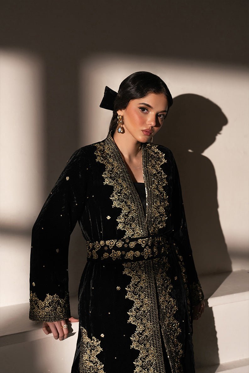 This outfits consists black velvet gown and velvet trouser paired with tasselled belt.gown is tilla embroidered and hand embellished with sequins, black and gold crystalsand cut dana.