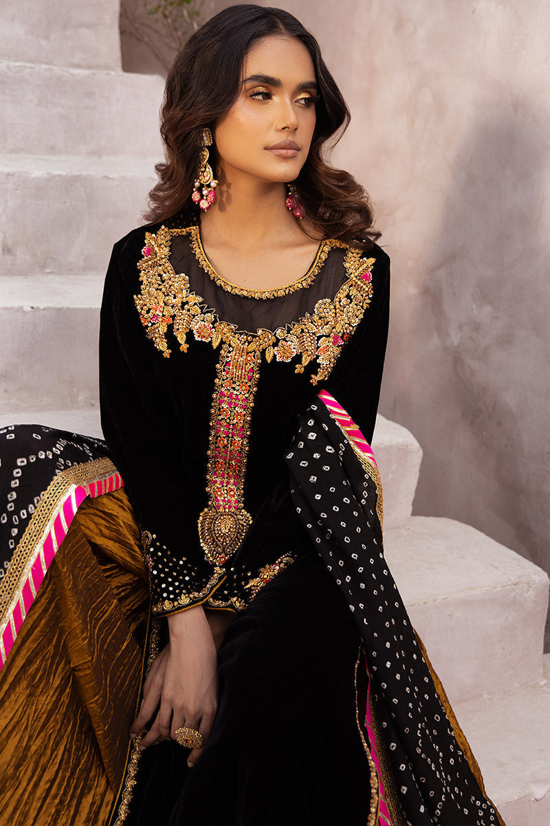 Elegant and sophisticated, this black long silhouette shirt is a masterpiece featuring intricate zardozi, kora, dabka, and resham details adorning the neckline, hem, daman, and sleeves. Paired flawlessly with a Crush Silk Lehnga, the ensemble is further enhanced by a stunning multi-color chunri dupatta, embellished with lace and tassel details.