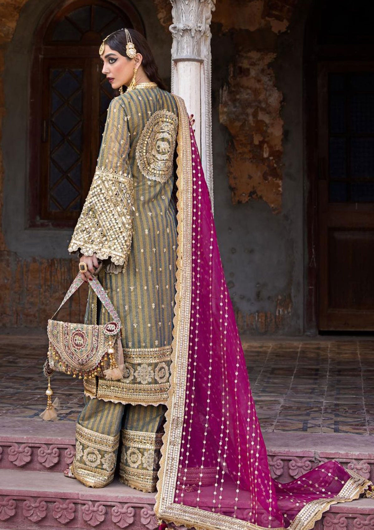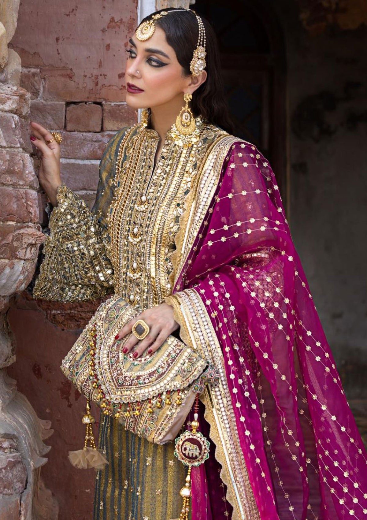Behold the 'Nawab Sahiba' ensemble, a regal masterpiece for the modern bride. This opulent creation is adorned with Tilla karandi stripes, meticulously embroidered and embellished with twin sequins, mirrorwork, and intricate Tilla work throughout the shirt. The ensemble is elevated by the addition of an organza dupatta featuring sequin strips and a sumptuous four-sided border, perfectly complementing the luxurious aesthetic. The elegance continues with the embroidered trouser, complete with borders of exquisite embellishments. 'Nawab Sahiba' is a testament to timeless grandeur and refined taste, making it the quintessential choice for brides who desire the utmost in sophistication and opulence.