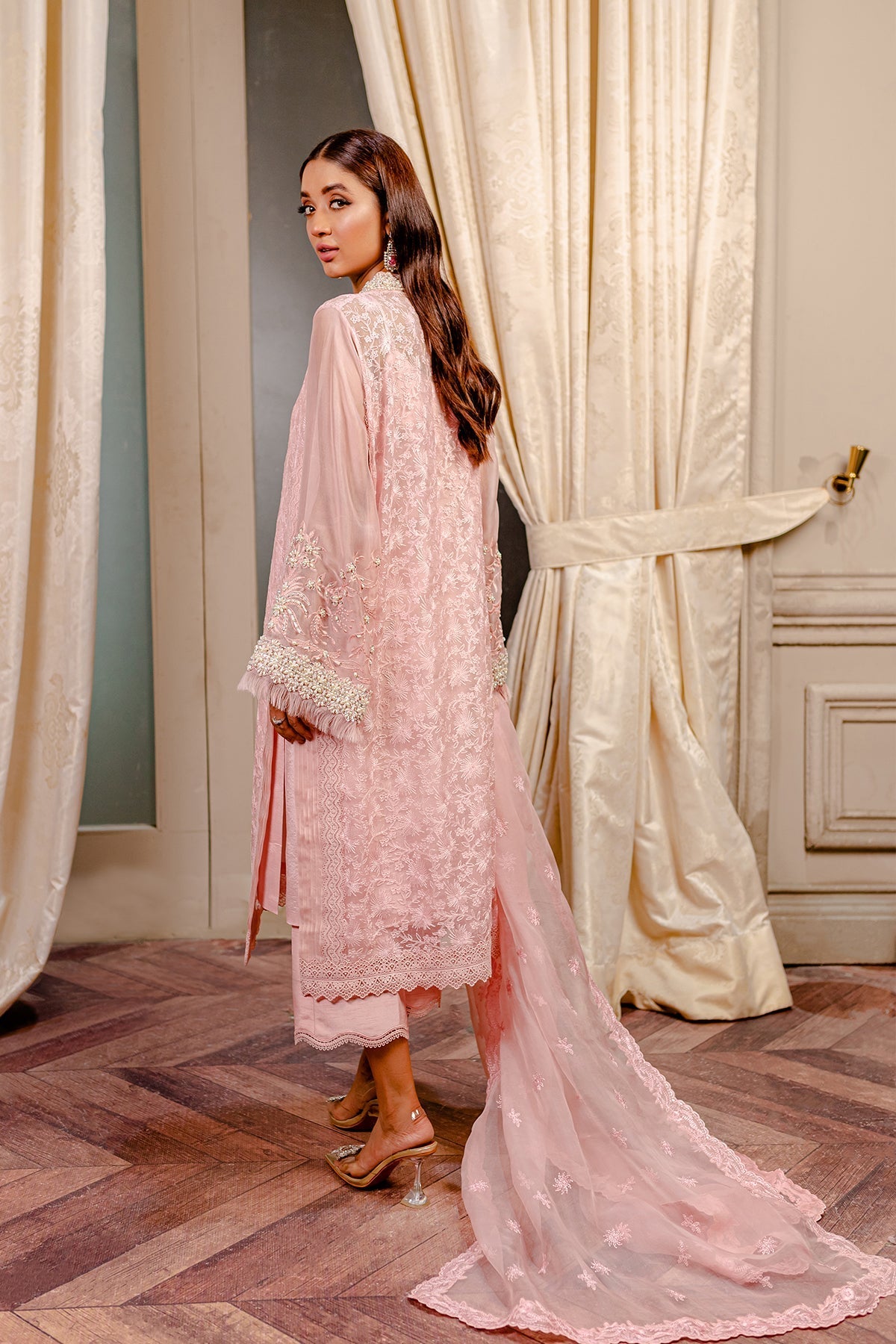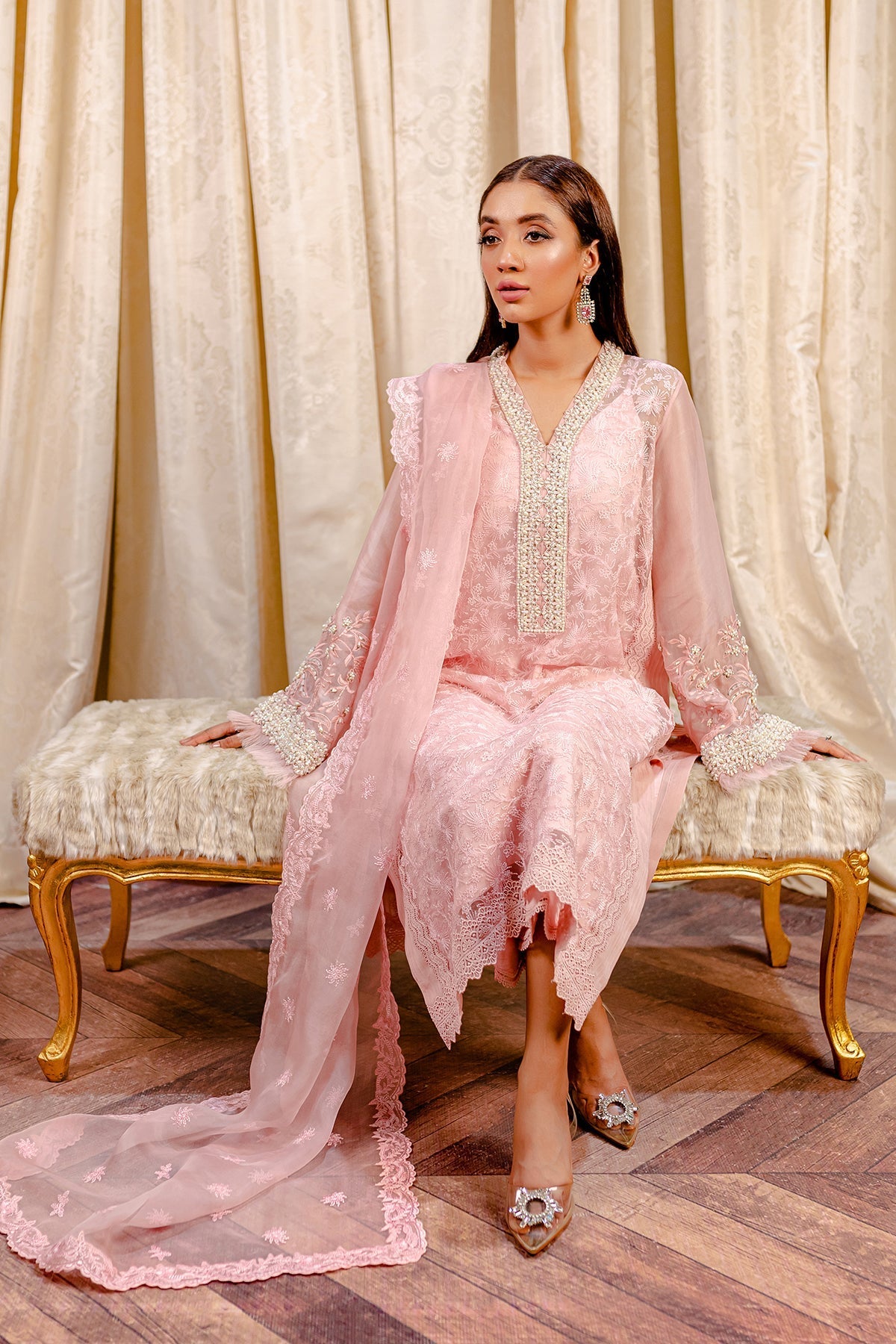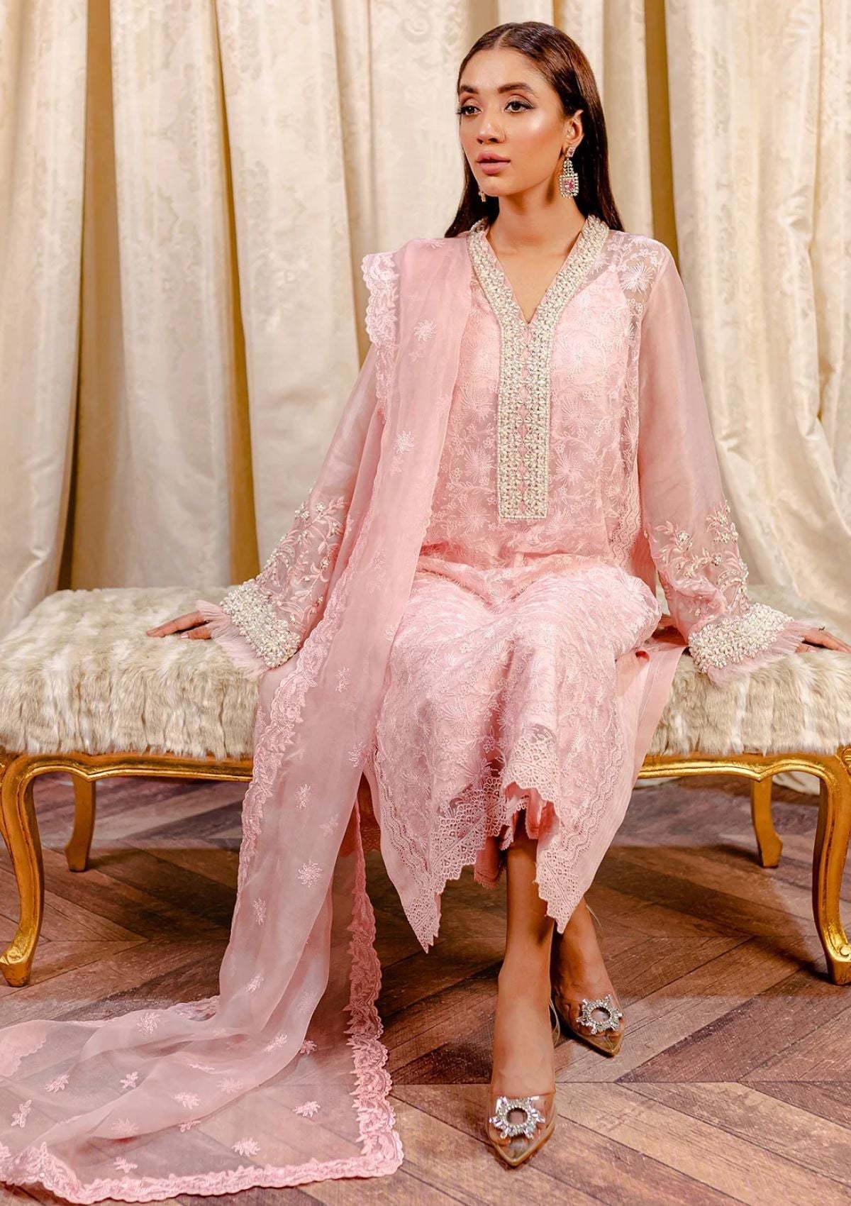 Feast your eyes on this dazzlingCrepe Rose, composed of a powder pink embroidered organza shirt, with an embellished, overlapping, neckline further enhanced by its embellished details. The stunning organza dupatta is accentuated with marvelous work and scalloped edges. This is paired with Korean Silk pants, making the whole outfit stand out among the crowd!