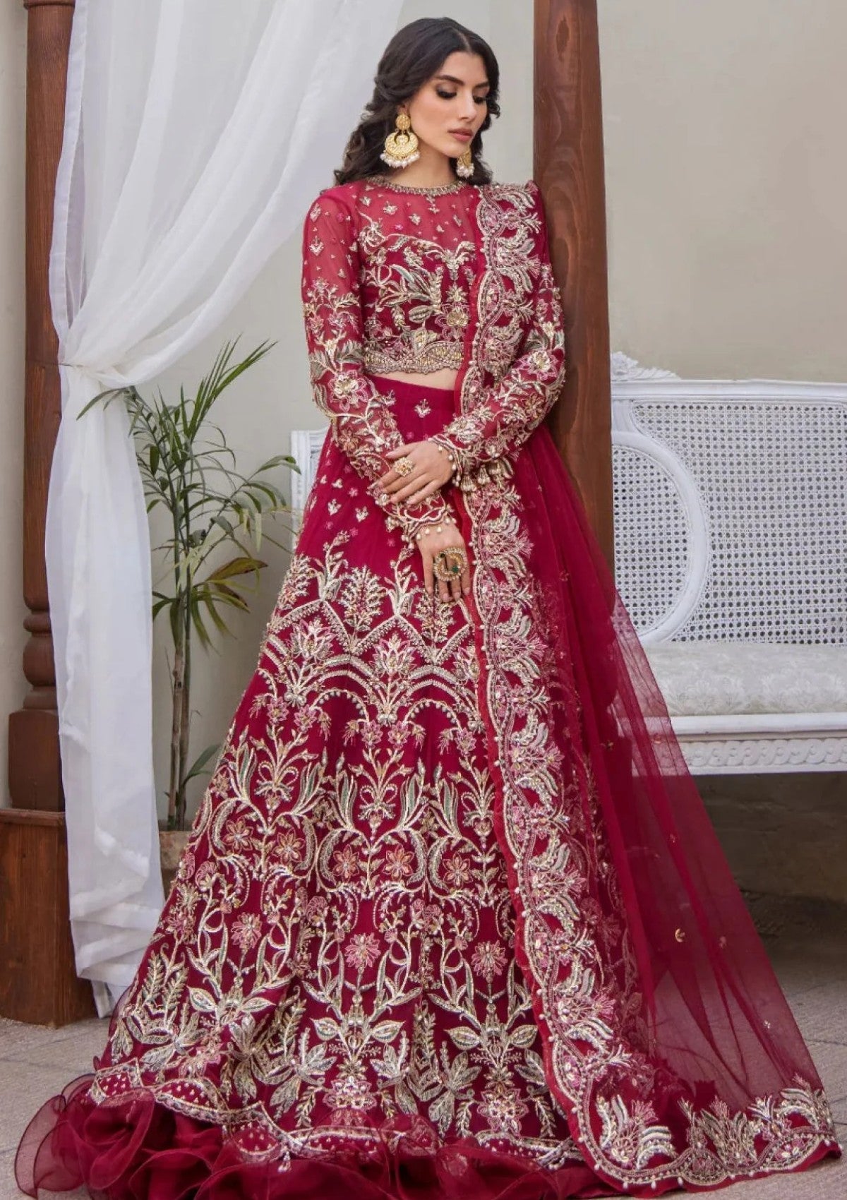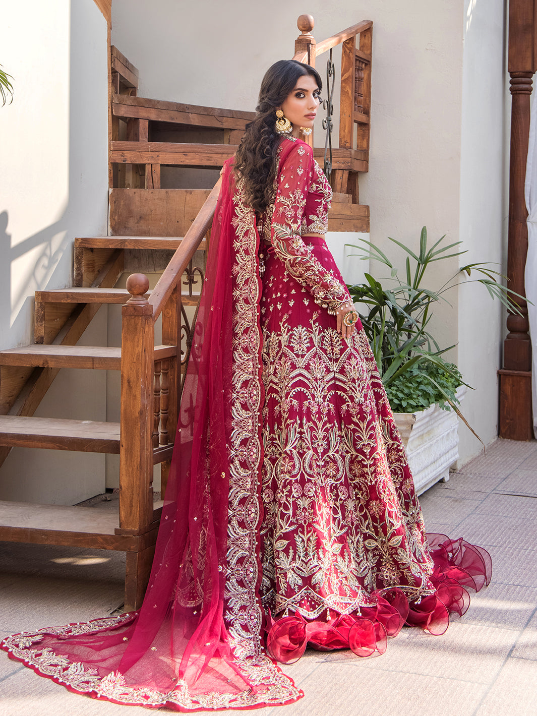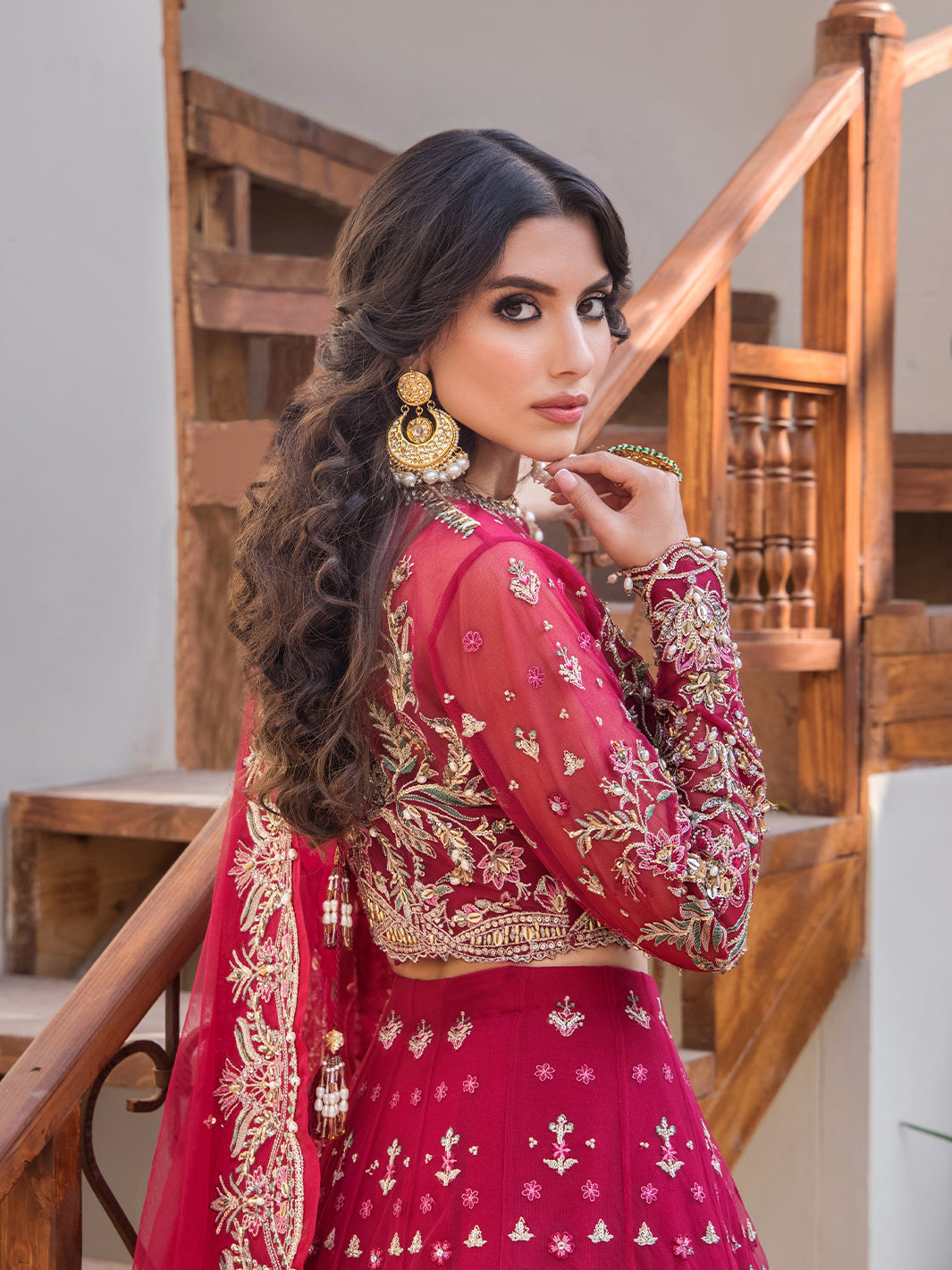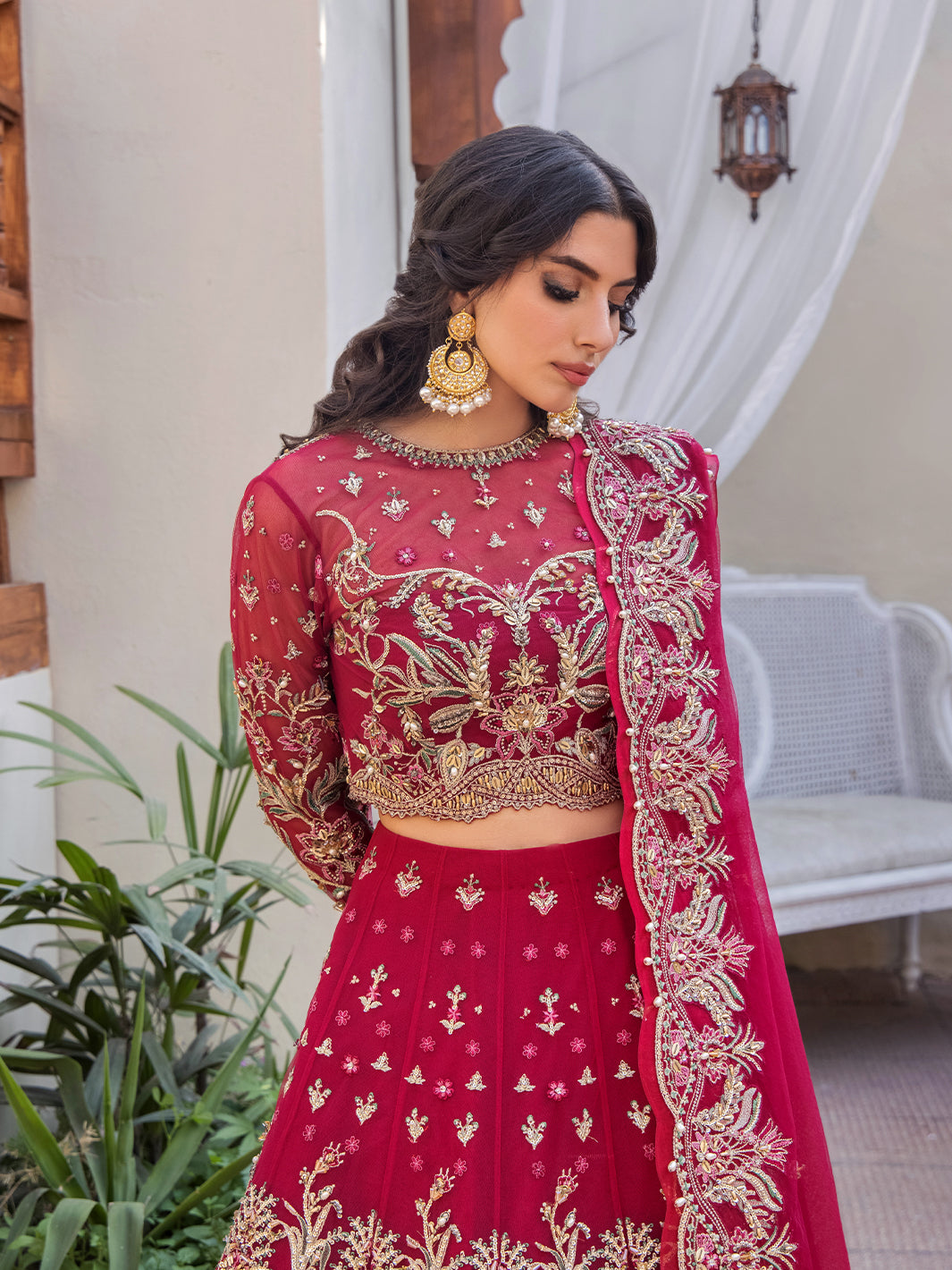 A splendid manifestation of enduring allure, behold this majestic creation unfurling upon delicate tulle, draped in a resplendent shade of deep crimson. In this timeless leghna choli ensemble, billowing yards of fabric cascade, each fold a testament to grace. Delicately adorned by the skilled hands of artisans, shimmering crystals and lustrous stones intertwine, meticulously etched to reveal a tapestry of enchantment fit for a celestial muse.