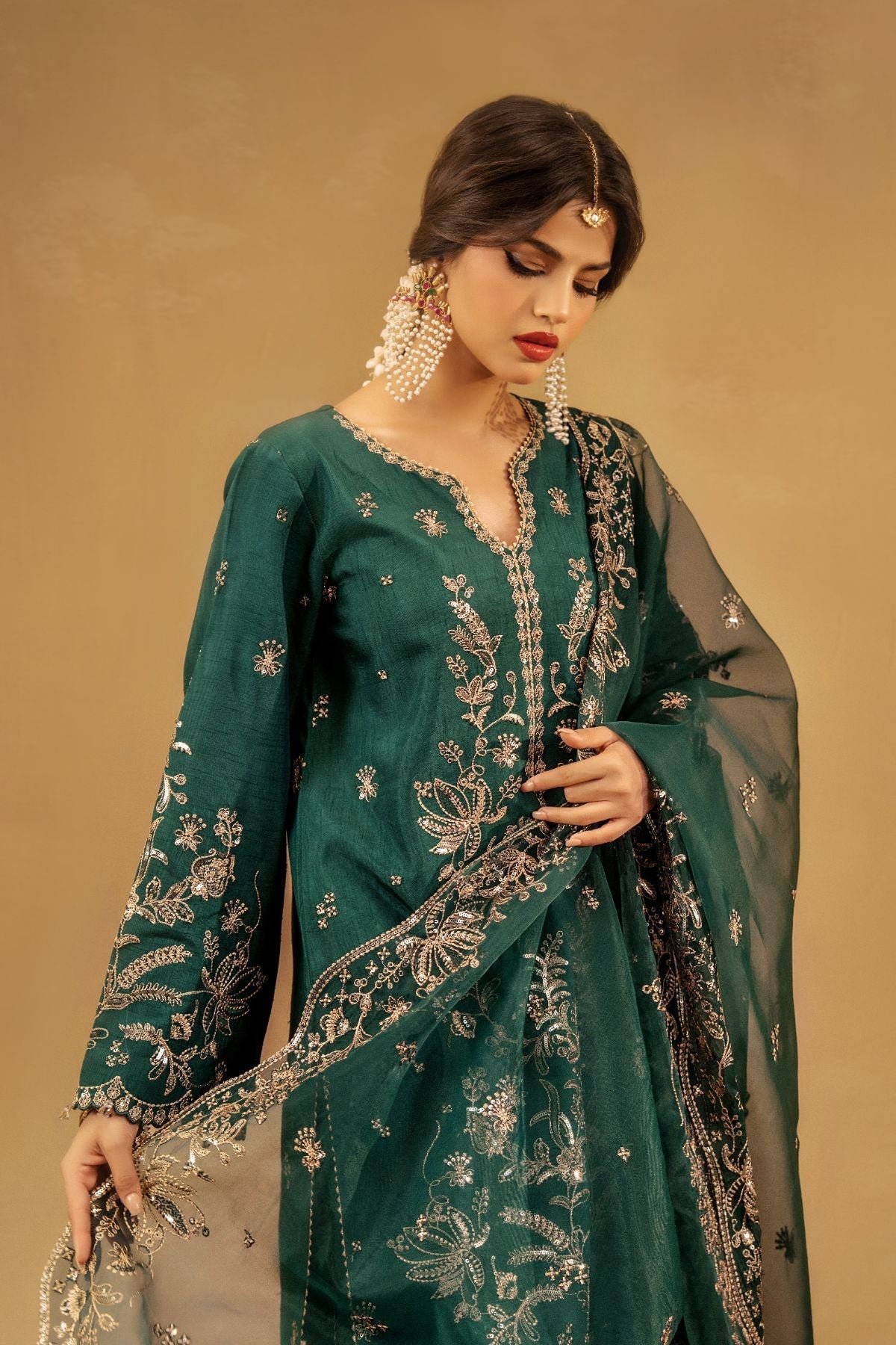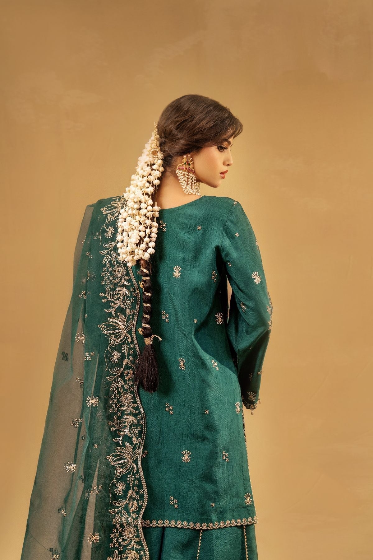 1) Embroidered rawsilk front 1 2) Embroidered rawsilk back 1 3) Embroidered rawsilk sleeves Left,Right 4) rawsilk trouser 2.5 yard 5) Embroidered trouser border 1.5 yard 6) Embroidered organza duppata 3 yard