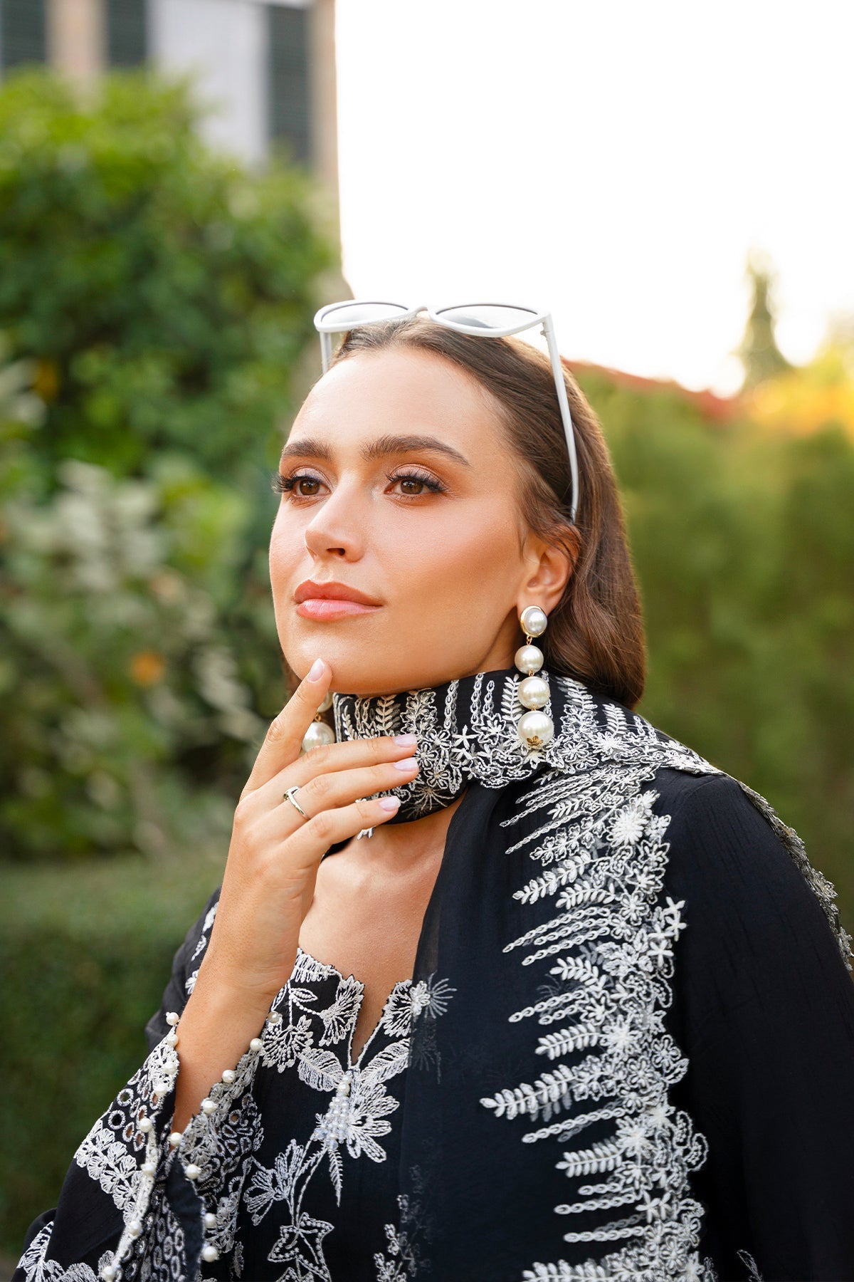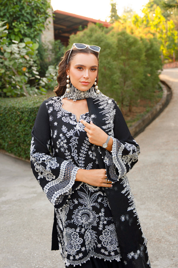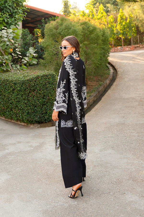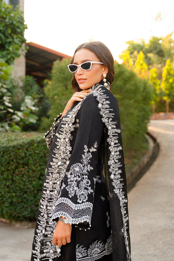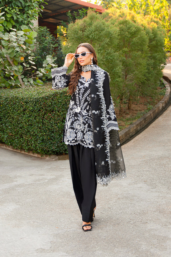 Step into timeless sophistication with our Black Shalwar Kameez, a striking tribute to classic elegance. Crafted from luxurious Korean raw silk, the short shirt is adorned with intricate contrast embroidery, creating a captivating interplay of textures and colors. The old-school broad shalwar enhances the ensembless vintage charm, exuding effortless grace. Delicate boring borders on the sleeves add a refined touch of craftsmanship, while the embroidered organza dupatta drapes beautifully, completing the look with sheer sophistication. Perfect for those who appreciate heritage silhouettes with a contemporary edge.