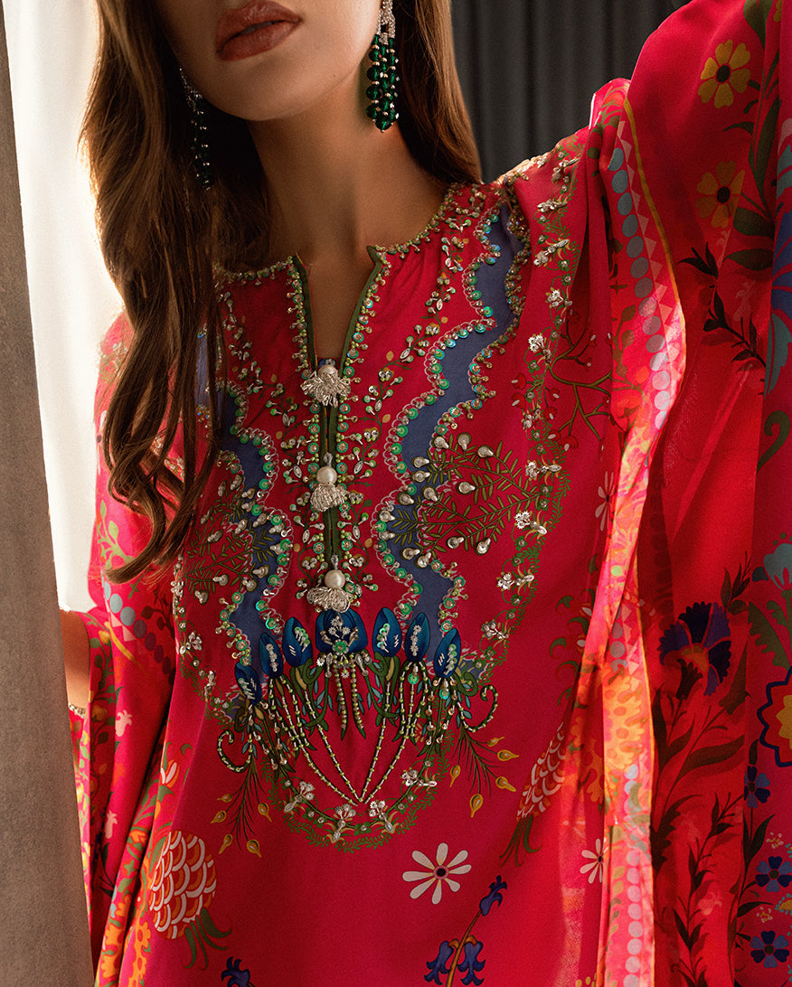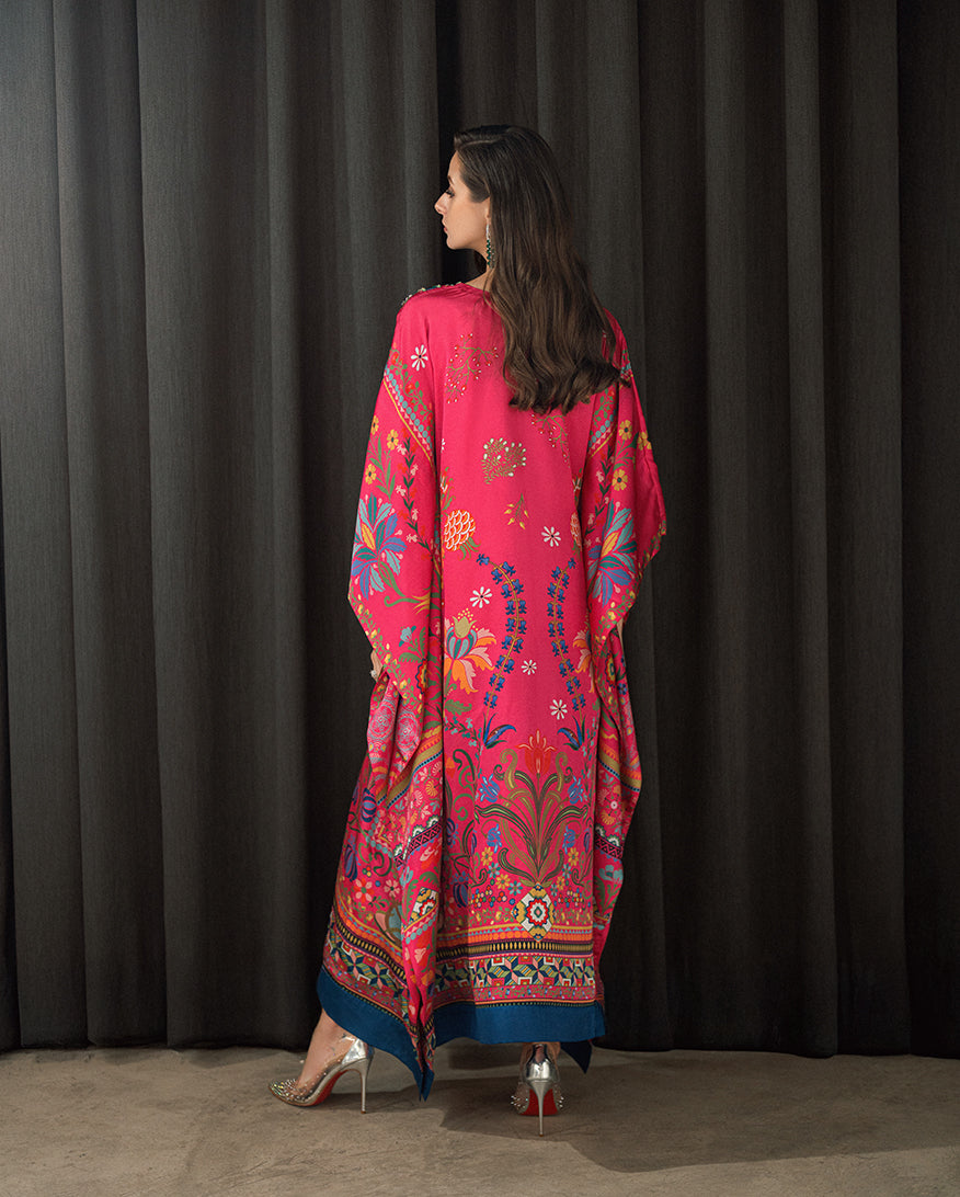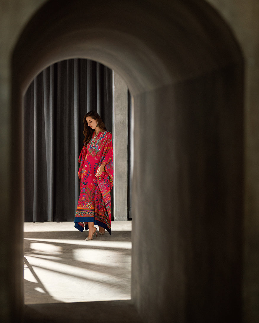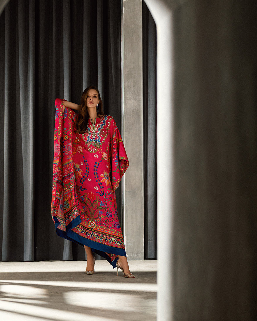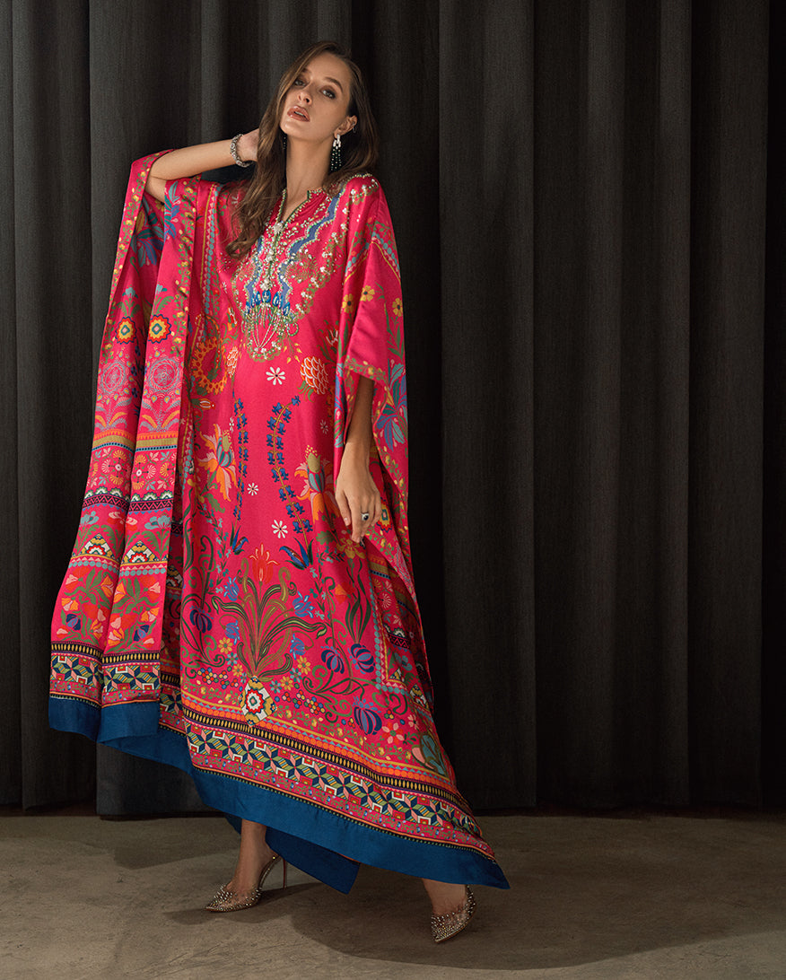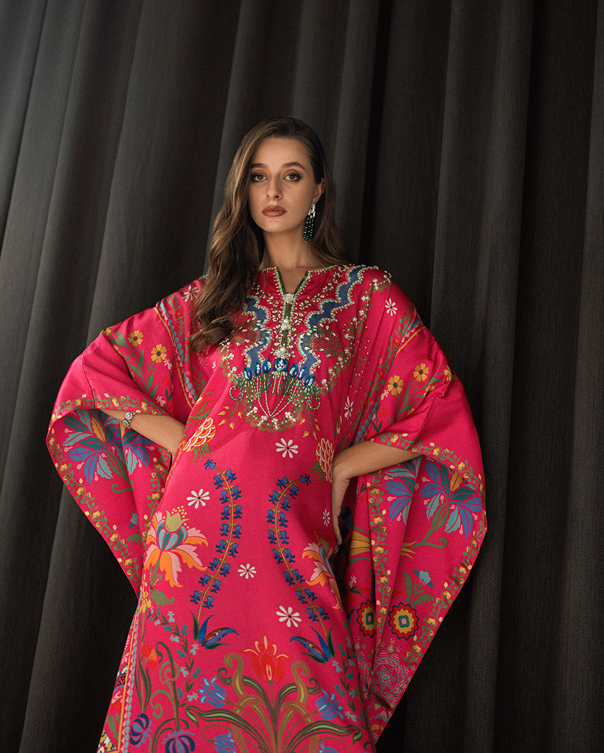 Elevate your wardrobe with our exquisite Sharmose Silk Kaftans, designed for effortless grace and timeless charm. Each piece showcases striking prints and features a luxuriously hand-embellished neckline, making it the perfect fusion of elegance and comfort.