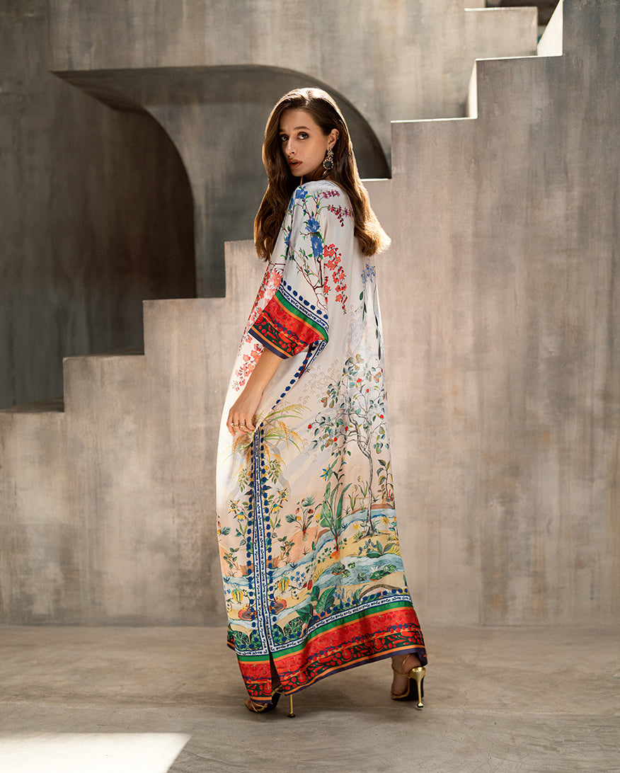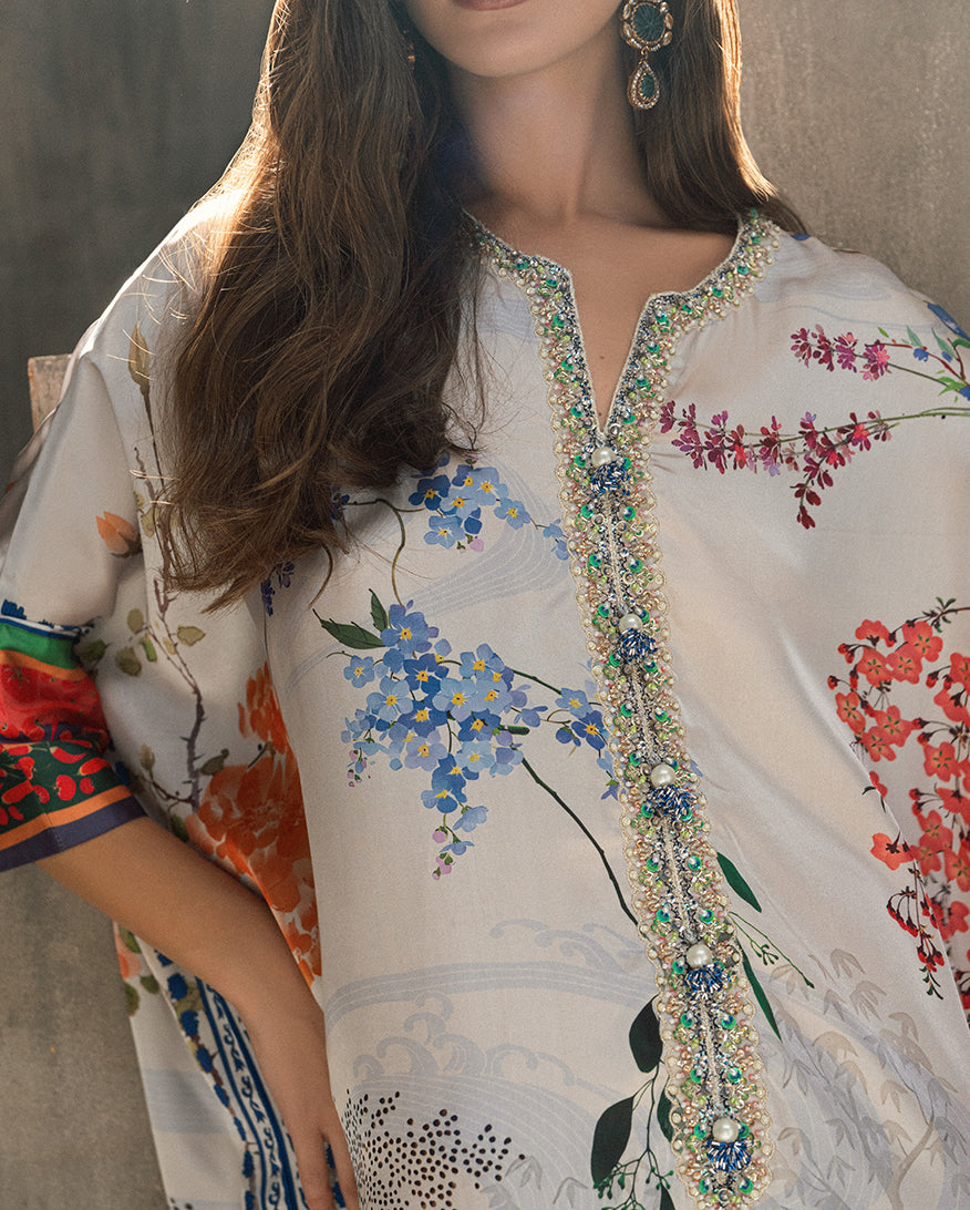 Elevate your wardrobe with our exquisite Sharmose Silk Kaftans, designed for effortless grace and timeless charm. Each piece showcases striking prints and features a luxuriously hand-embellished neckline, making it the perfect fusion of elegance and comfort.